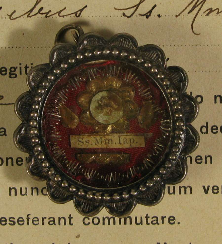 Round glass-fronted silver reliquary theca dating to 1920's housing first class ex ossibus (from the bone) relics of the Twenty-Six Martyrs of Japan. The relics are affixed to a red silk background and identified on a typographic cedula as Ss. Mm. Iap. (Holy Martyrs [of] Japan). On the back, under a protective cap, the theca is protected by a seal of red wax with a hardly visible imprint of a coat of arms of the Order of Friars Minor Capuchin sealed by Fr. Anthony M. Santarelli, Postulator General of the Order in 1920's responsible for a cause for beatification and canonization through the judicial processes required by the Roman Catholic Church. The reliquary is accompanied by the original matching authentics document issued by Fr. Anthony M. Santarelli and dated 1927.