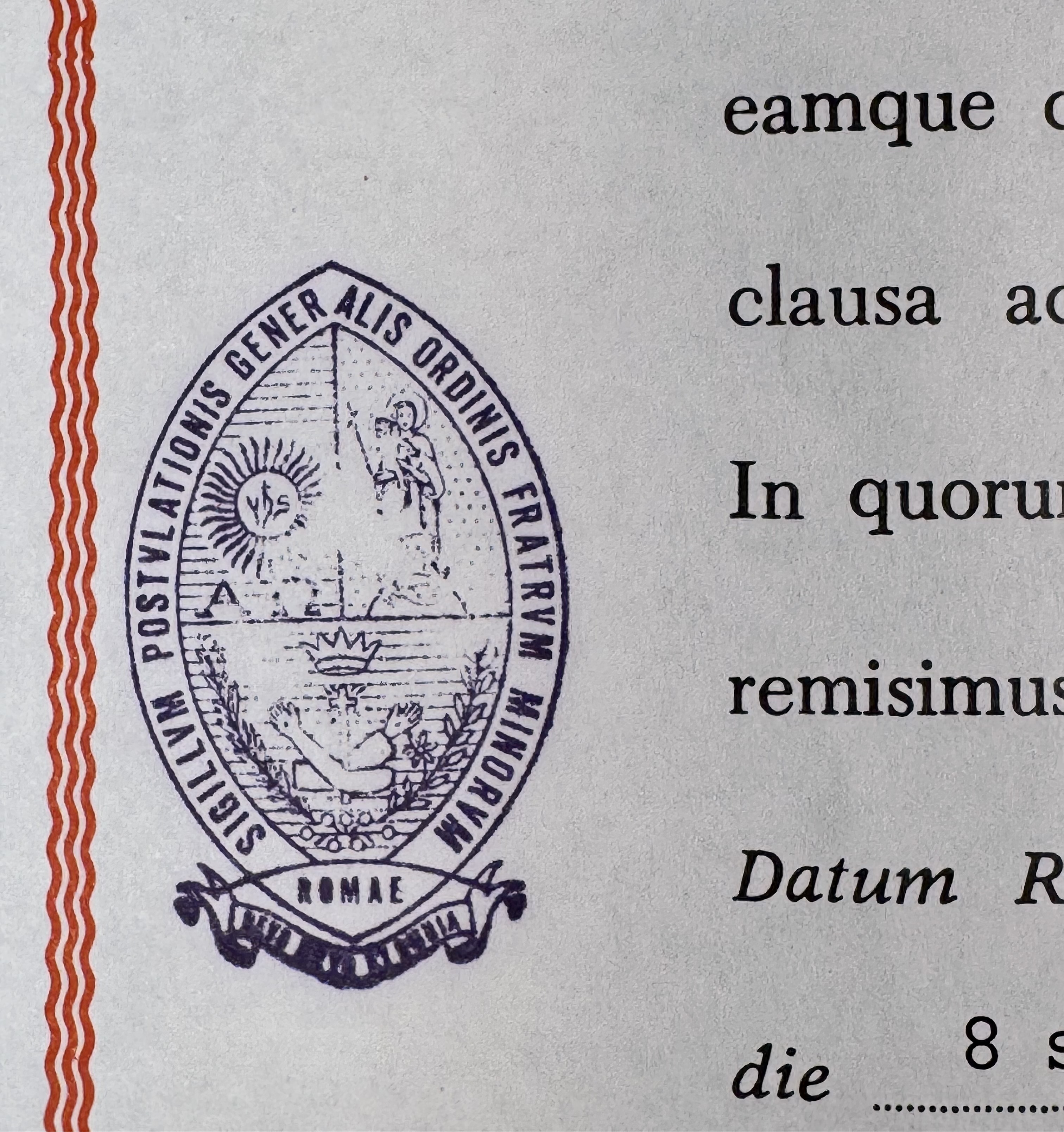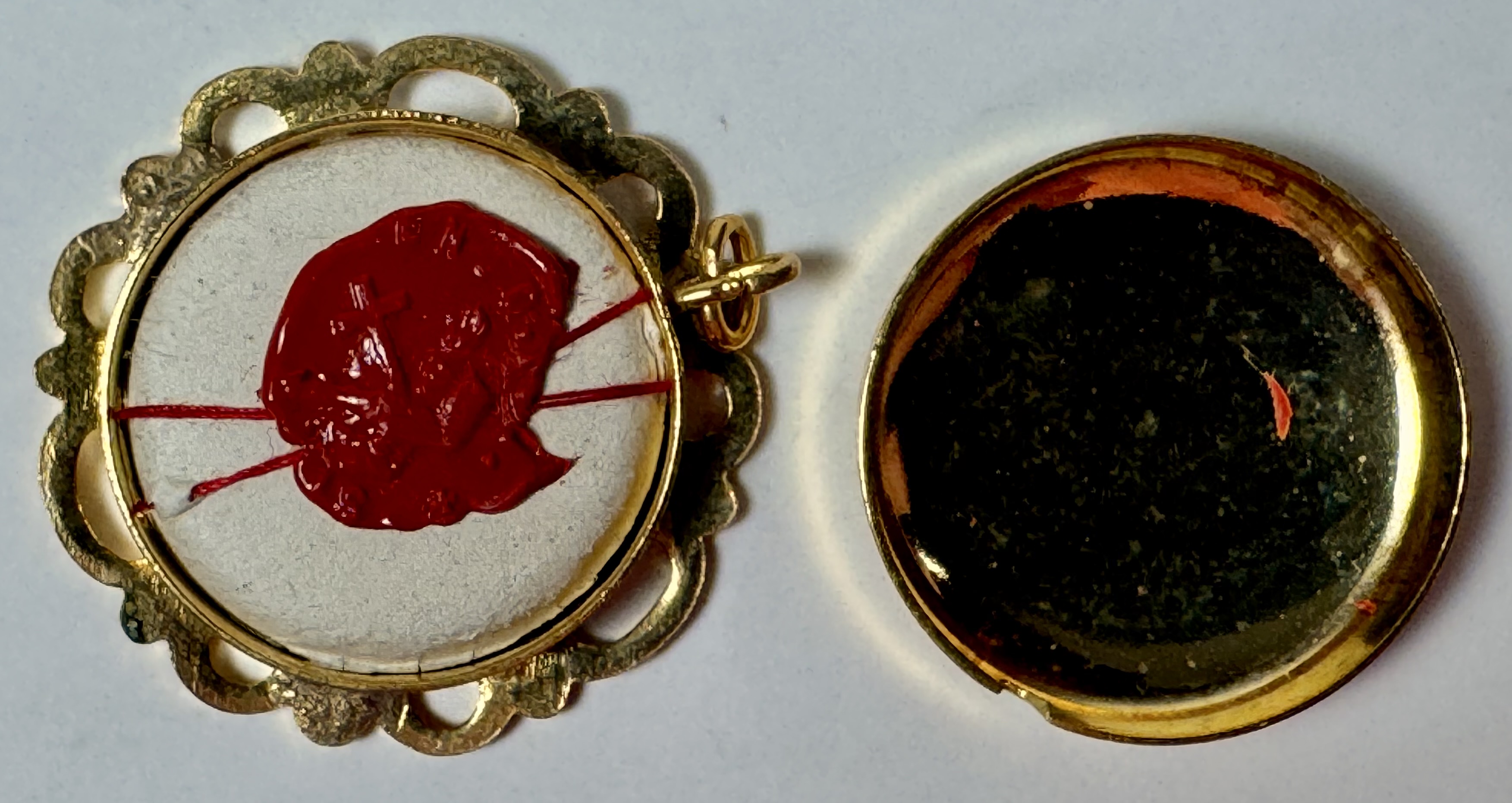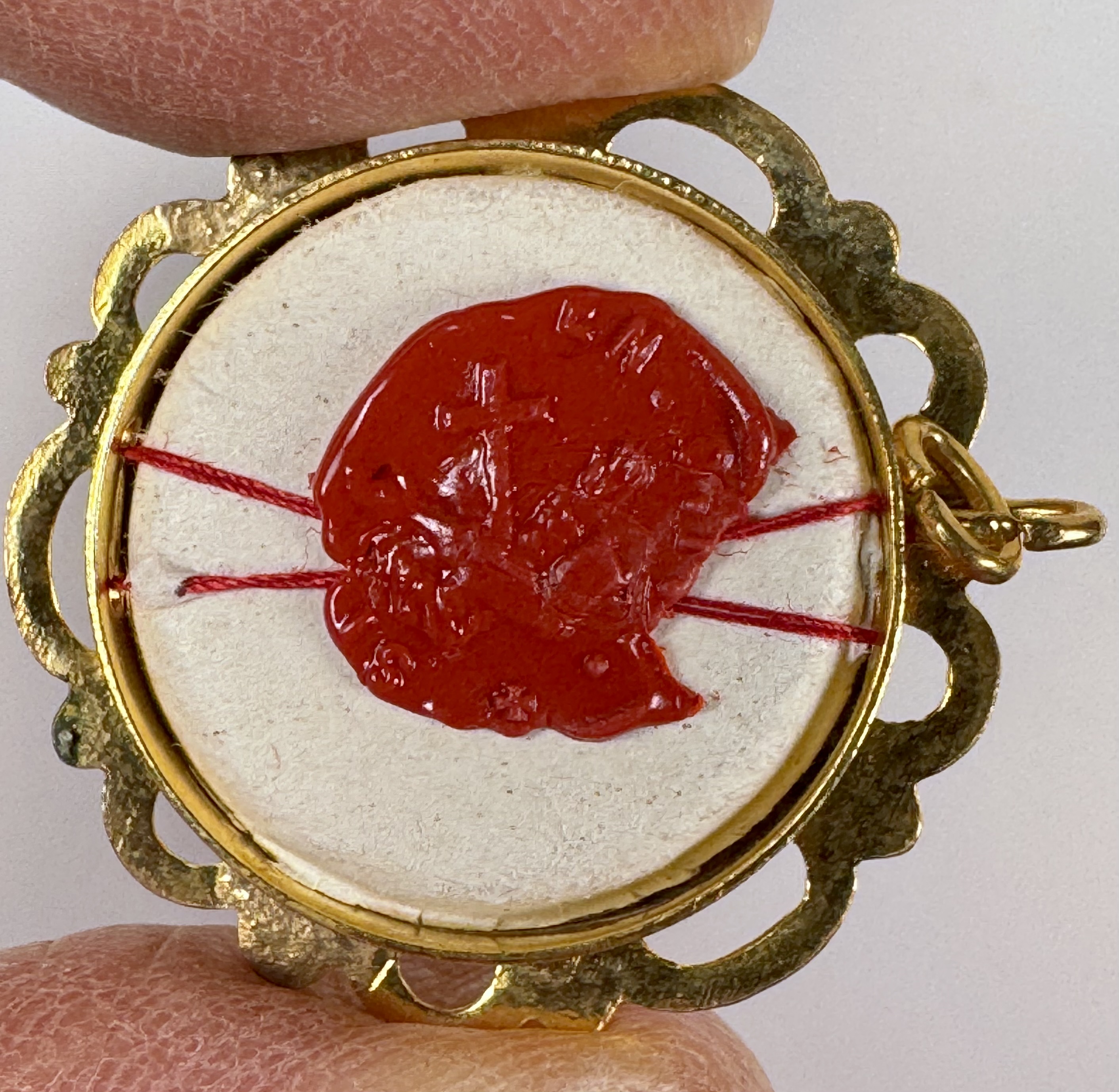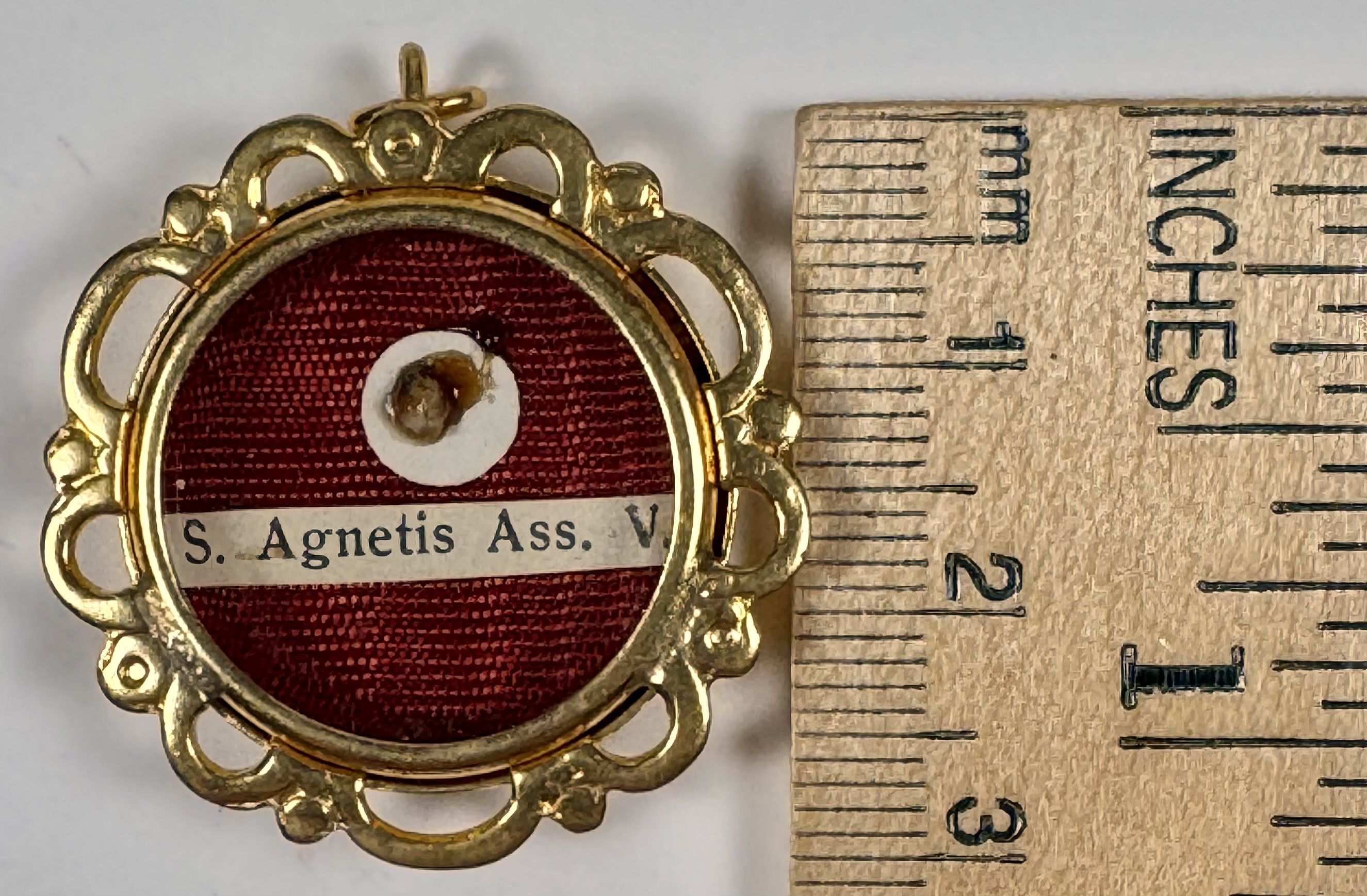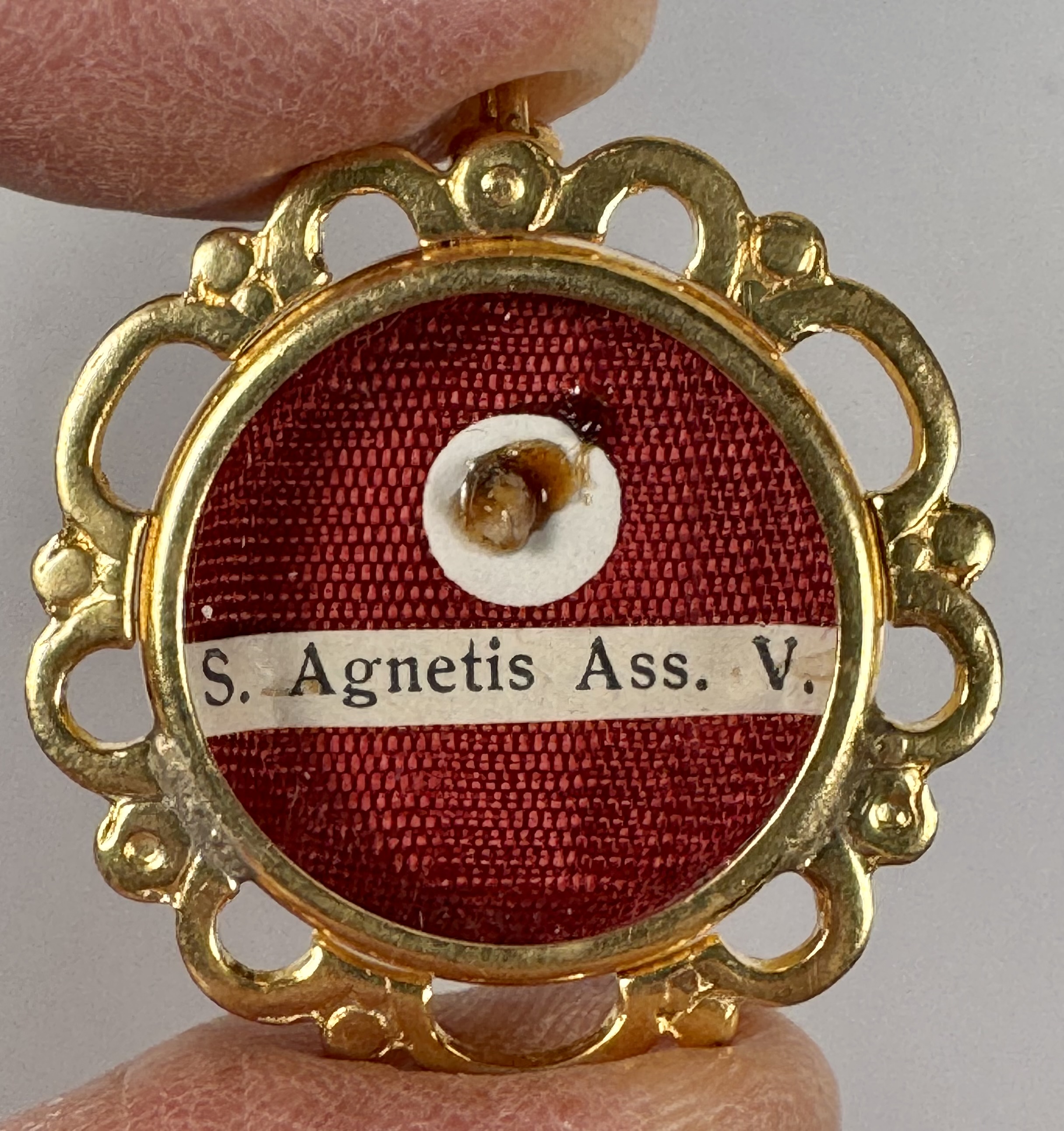 Round glass-fronted yellow-metal reliquary theca housing the second-class ex indumentis (of the clothings) relic of Saint Agnes of Assisi. The relic is affixed to a red silk ground and identified in Latin on a typeset cedula label as S. Agnetis Ass. V. (Saint Agnes of Assisi, Virgin). On the back, under the protective cap, the theca is secured with a seal of red Spanish wax bearing an imprint of a coat of arms of the Order of Friars Minor (commonly known as the Franciscans). The relic is accompanied by the original matching authentics document issued and signed in 1992 by the Postulator General of the Order responsible for the cause of beatification and canonization.