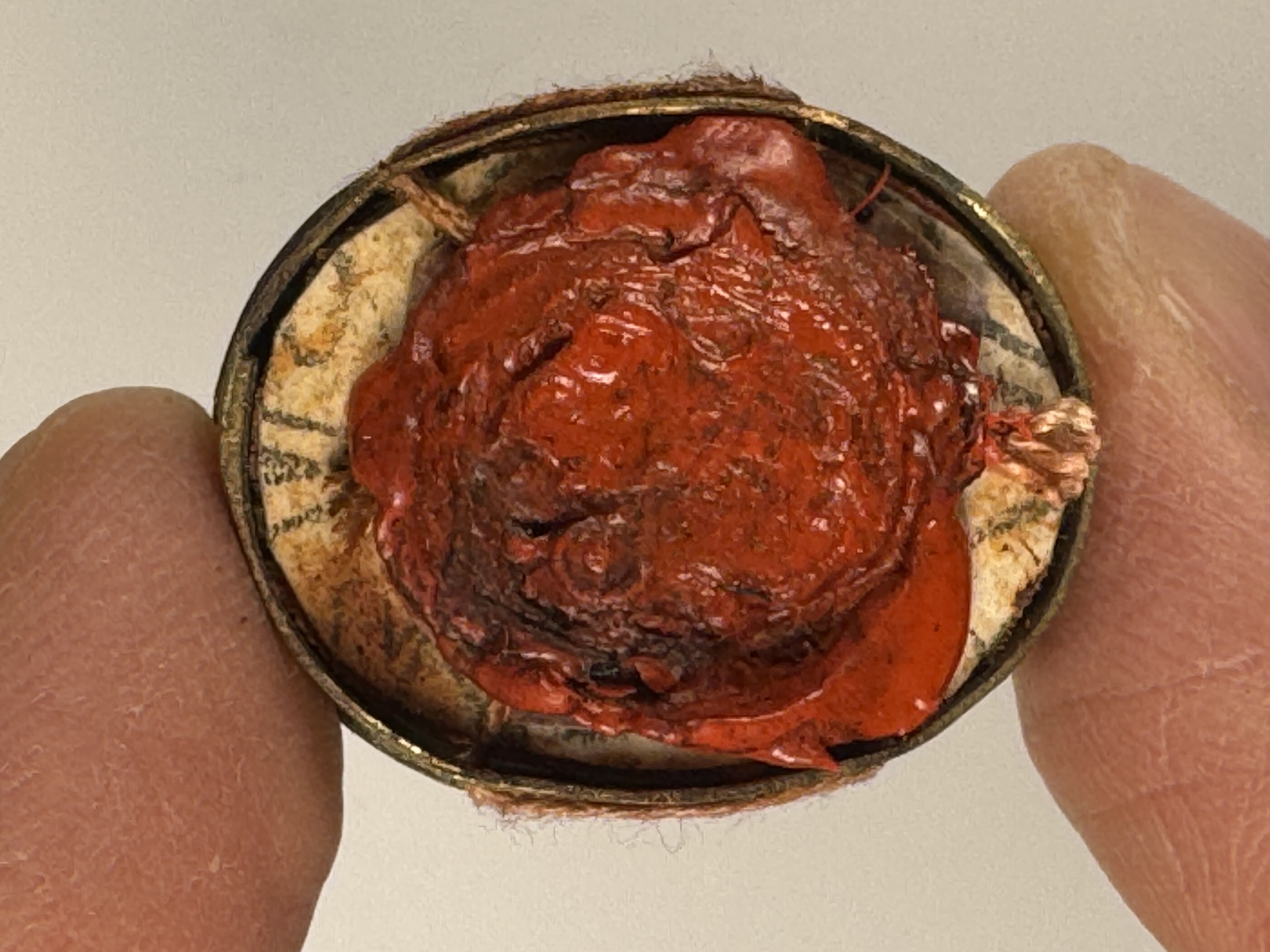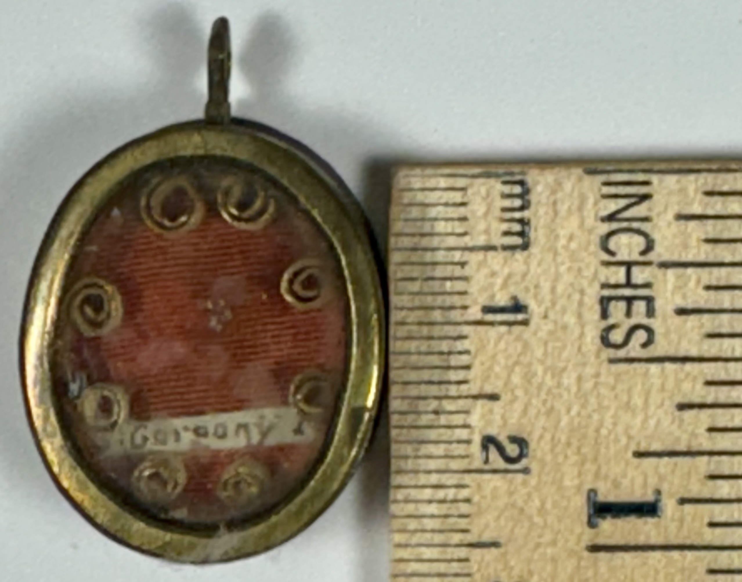 Oval brass glass-fronted pendant reliquary theca housing first-class ex ossibus (of the bone) relic of Saint Gorgonius of Nicomedia.The relic is affixed to a a red silk ground surrounded by gilt paperolle ornamentation and identified in Latin on a manuscript cedula label as S. Gorgonÿ, M. (Saint Gorgonius, Martyr). On the back, under a protective cap, the theca is secured with a perfectly preserved seal of red Spanish wax bearing an imprint with a coat of arms of Fr. Antonio Cantoni (†1781), Bishop of Faenza, Italy (1742–1767) and Archbishop of Ravenna, Italy (1767–1781).