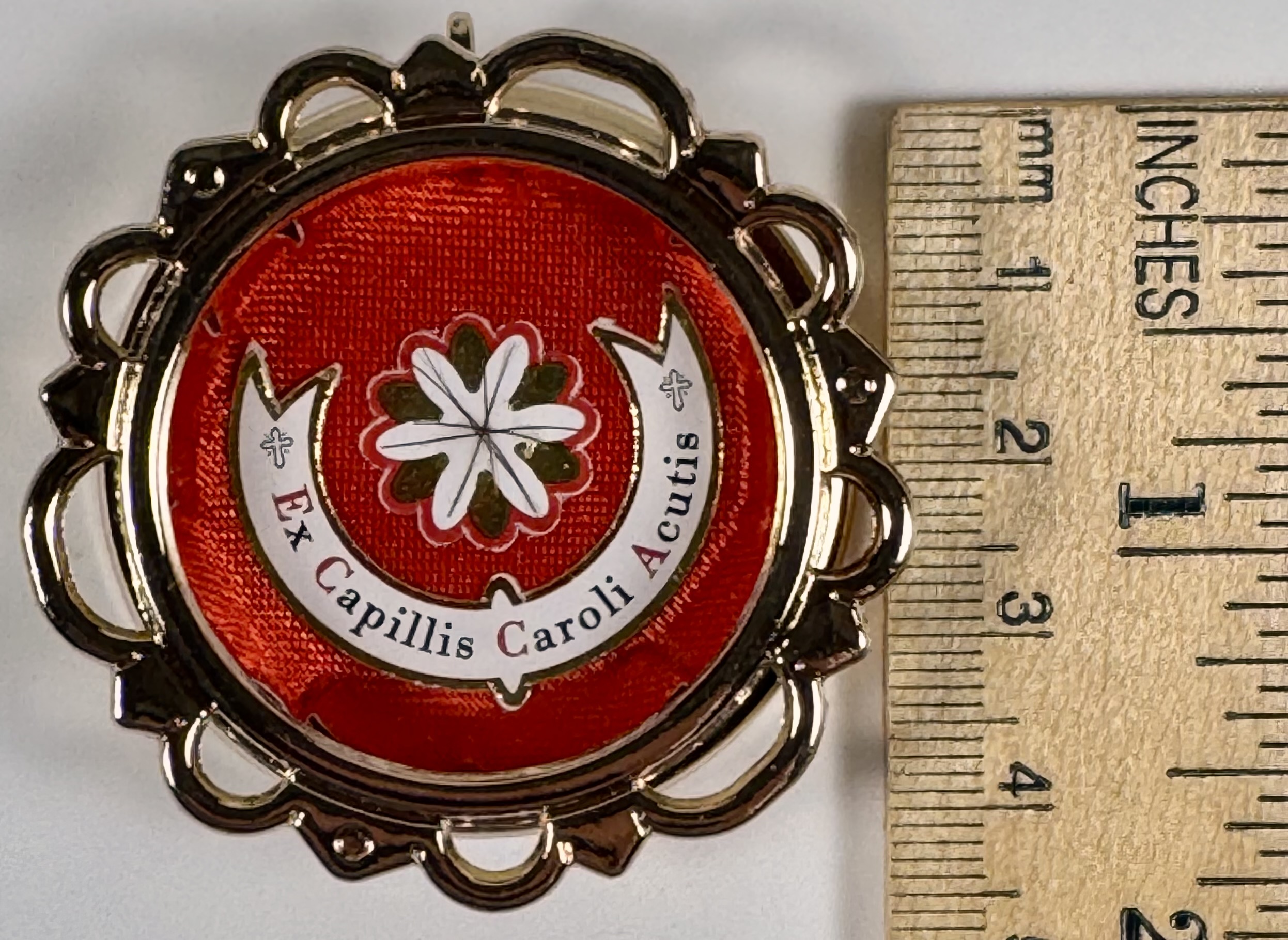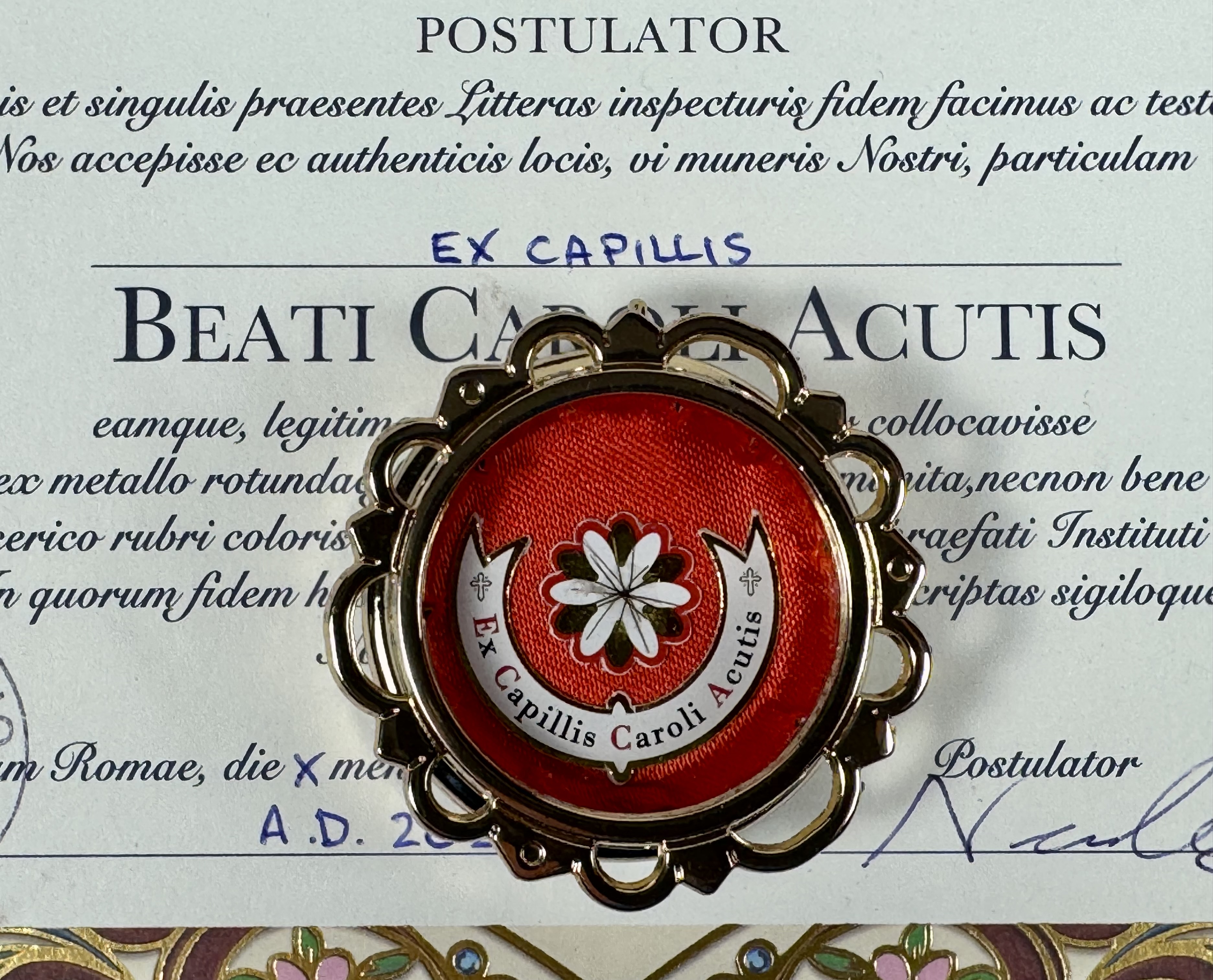 Extremely rare large round glass-fronted metal reliquary theca housing the first-class Ex Capillis (of the Hair) pre-canonization relics of Saint Carlo Acutis. The relics consisting of multiple clippings of hair are affixed to a six-petal flower-shaped paper on a ground of red silk and are identified in Latin on a bi-color typeset cedula label as Ex Capillis Caroli Acutis (Of the hair of Carlo Acutis).  On the back, under a protective cap, the theca is secured with a seal of red Spanish wax bearing an imprint of the Postulator General for the Cause of the Beatification of Carlo Acutis. The reliquary is housed in its original case of issue, with a seal of the Postulator General for the cause of Carlo Acutis' canonization. The relic is accompanied by the original matching authentics document issued and sealed by the order of the Postulator General on October 10, 2020 - the very day of his beatification. Please note that, due to its scarcity, this item is not subject to any discounts.