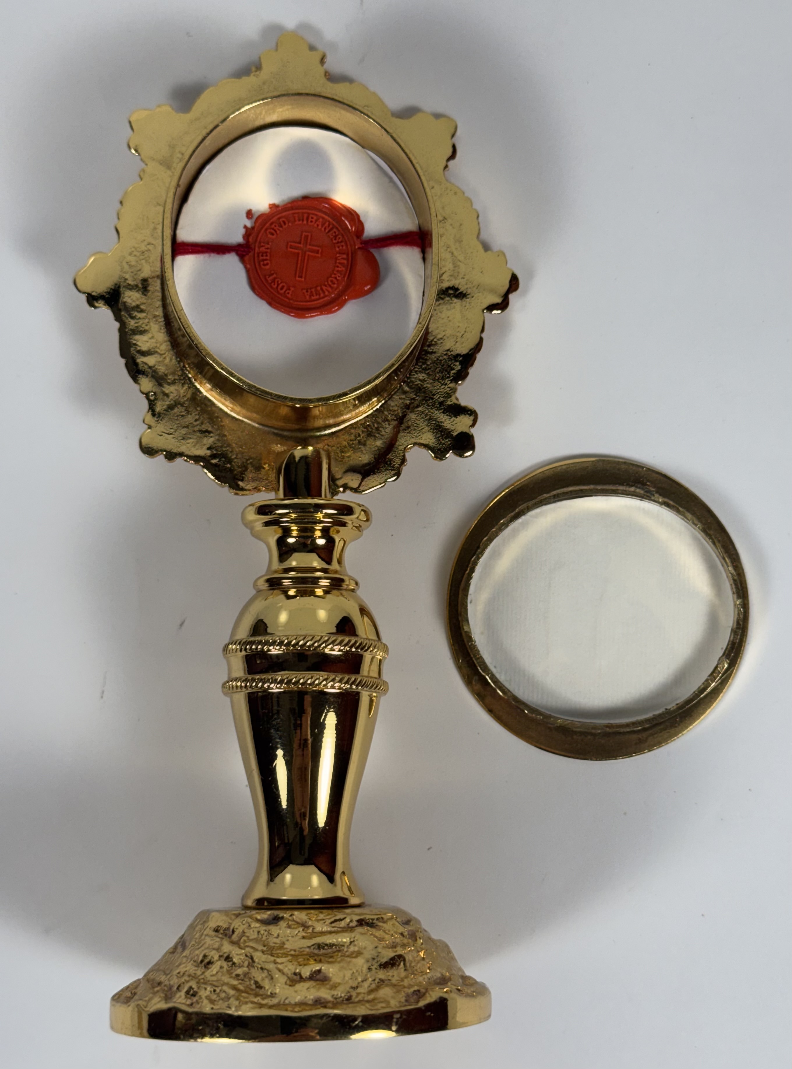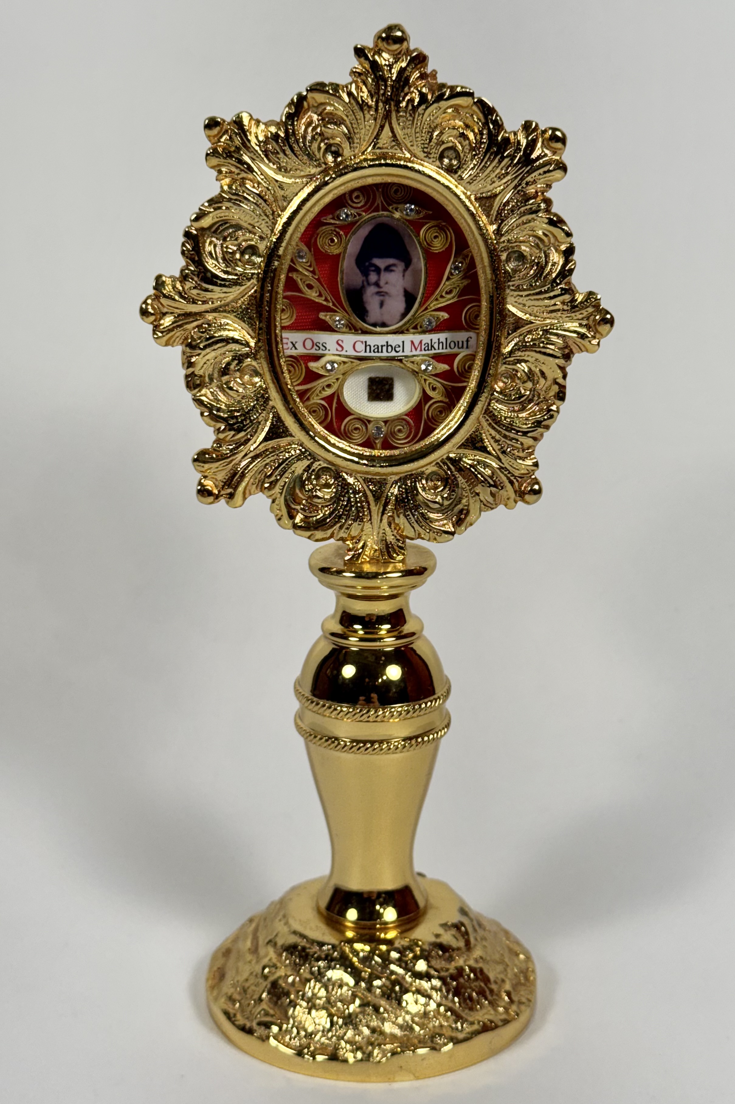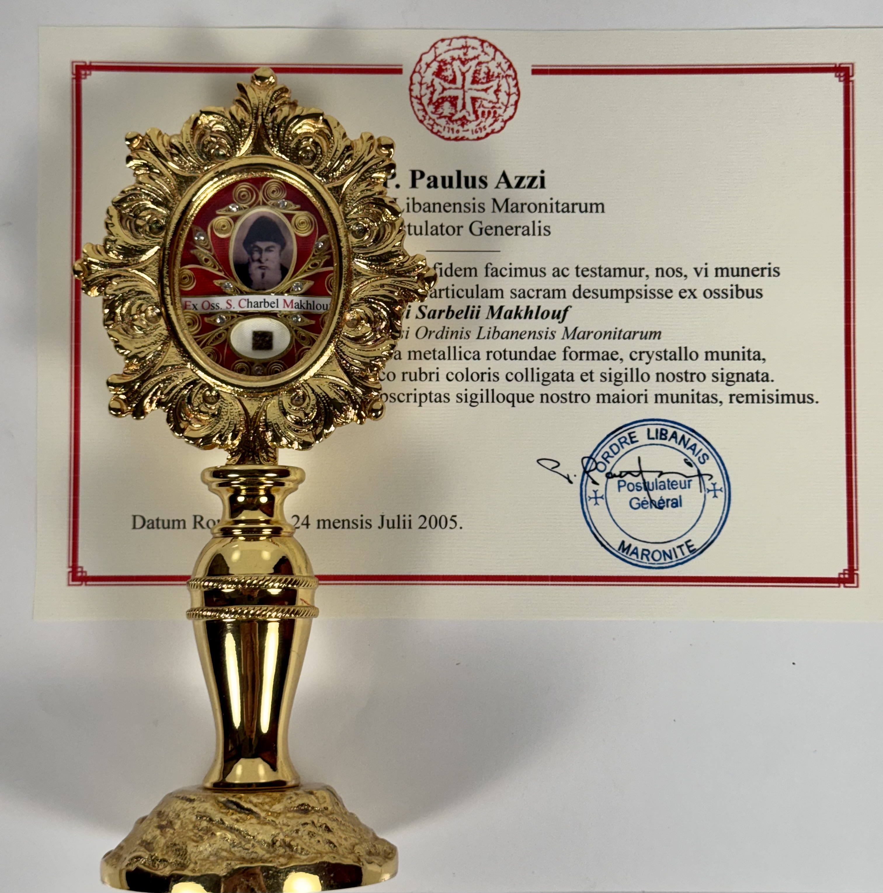 Attractive small glass-fronted gilt-metal reliquary monstrance housing the first-class ex ossibus (of the bone) relic of a Maronite Saint Charbel Makhlouf. Under a portrait of the Saint, a substantial relic is affixed to a red silk ground surrounded by paperole ornamentation and identified in Latin on a bi-color typeset cedula label as Ex Oss. S. Charbel Makhlouf(of the bone of Saint Charbel Makhlouf). On the back, under a protective cap, the reliquary is secured with a seal of red Spanish wax bearing an imprint of a coat of arms of the Postulator General of the Lebanese Maronite Order. The reliquary is accompanied by the matching authentics document issued and signed by the Postulator General on July 24th, 2005 (the day of his Feast).