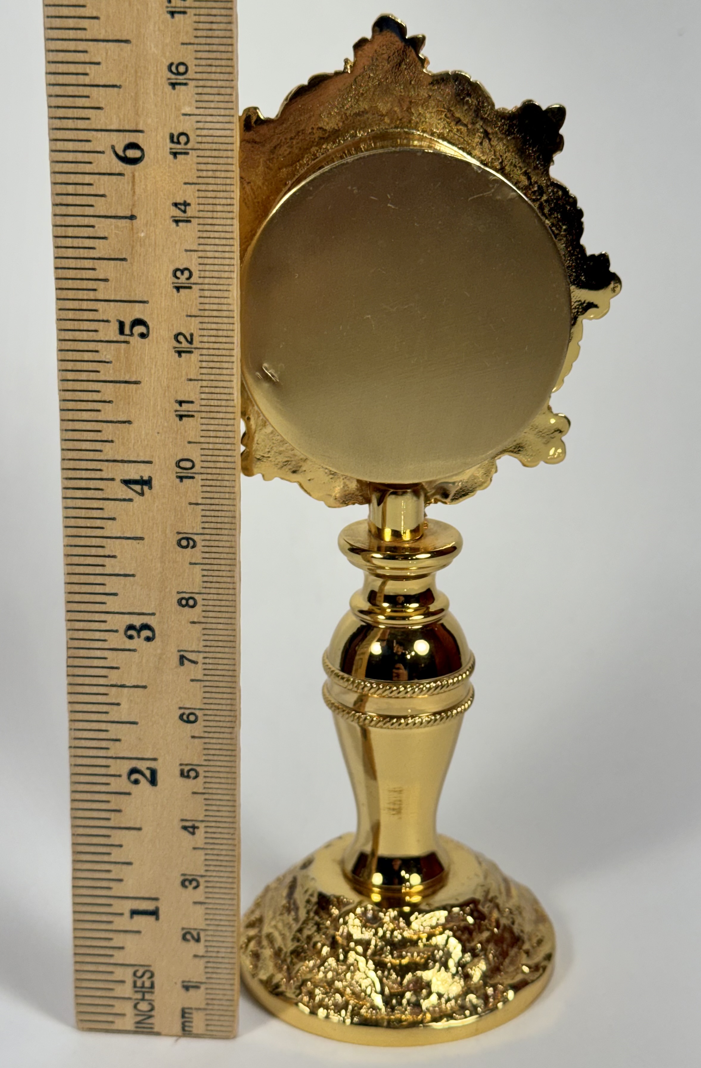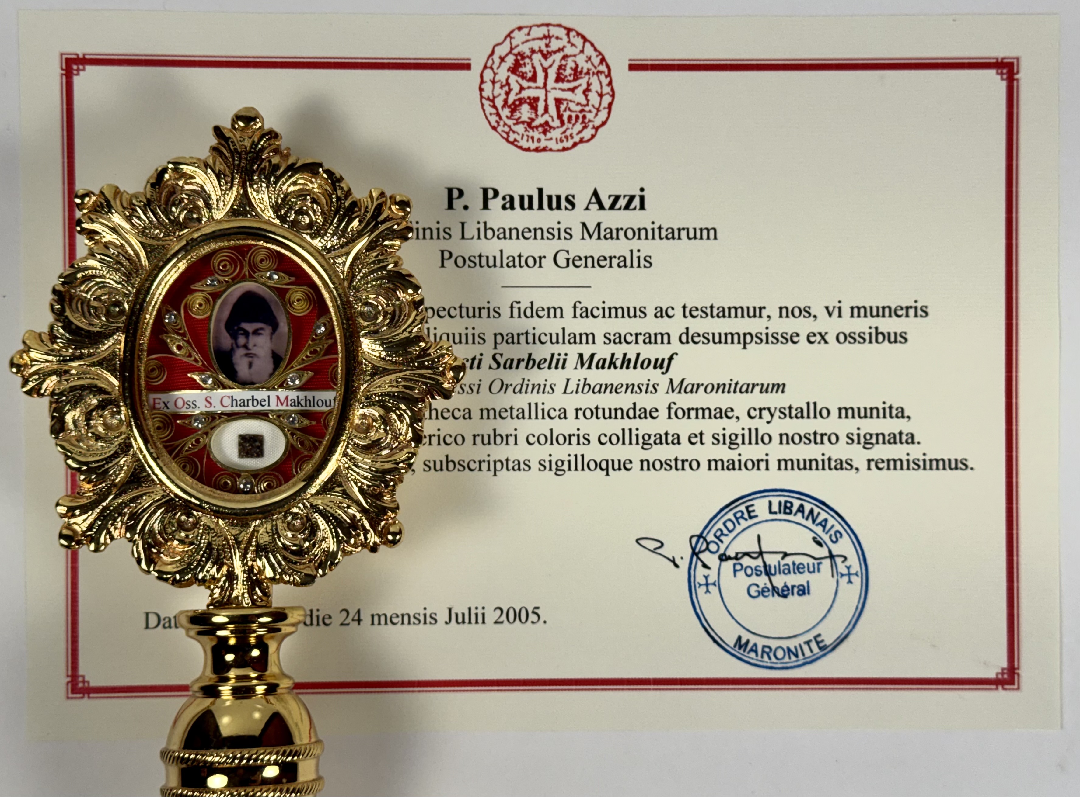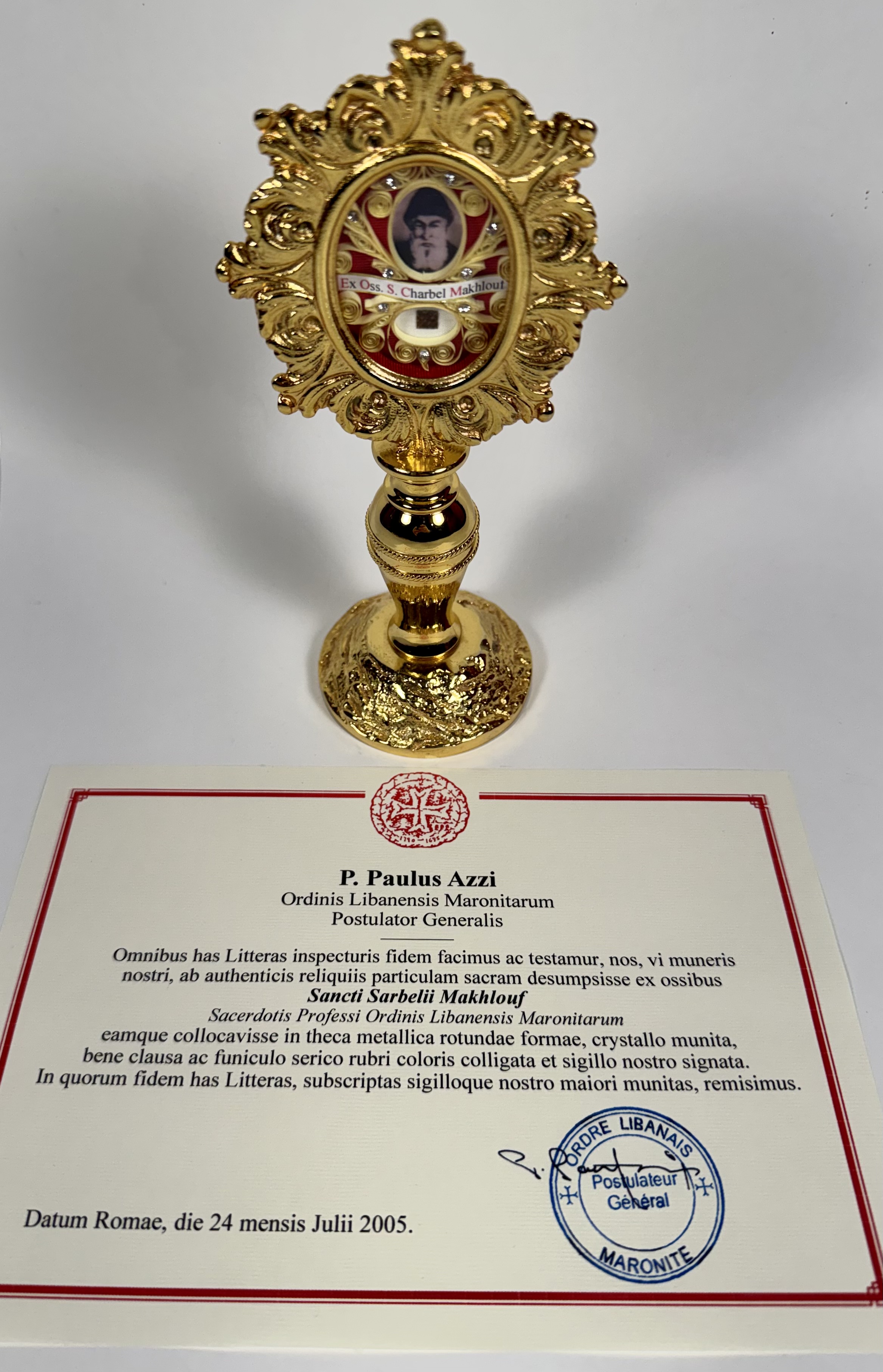 Attractive small glass-fronted gilt-metal reliquary monstrance housing the first-class ex ossibus (of the bone) relic of a Maronite Saint Charbel Makhlouf. Under a portrait of the Saint, a substantial relic is affixed to a red silk ground surrounded by paperole ornamentation and identified in Latin on a bi-color typeset cedula label as Ex Oss. S. Charbel Makhlouf(of the bone of Saint Charbel Makhlouf). On the back, under a protective cap, the reliquary is secured with a seal of red Spanish wax bearing an imprint of a coat of arms of the Postulator General of the Lebanese Maronite Order. The reliquary is accompanied by the matching authentics document issued and signed by the Postulator General on July 24th, 2005 (the day of his Feast).