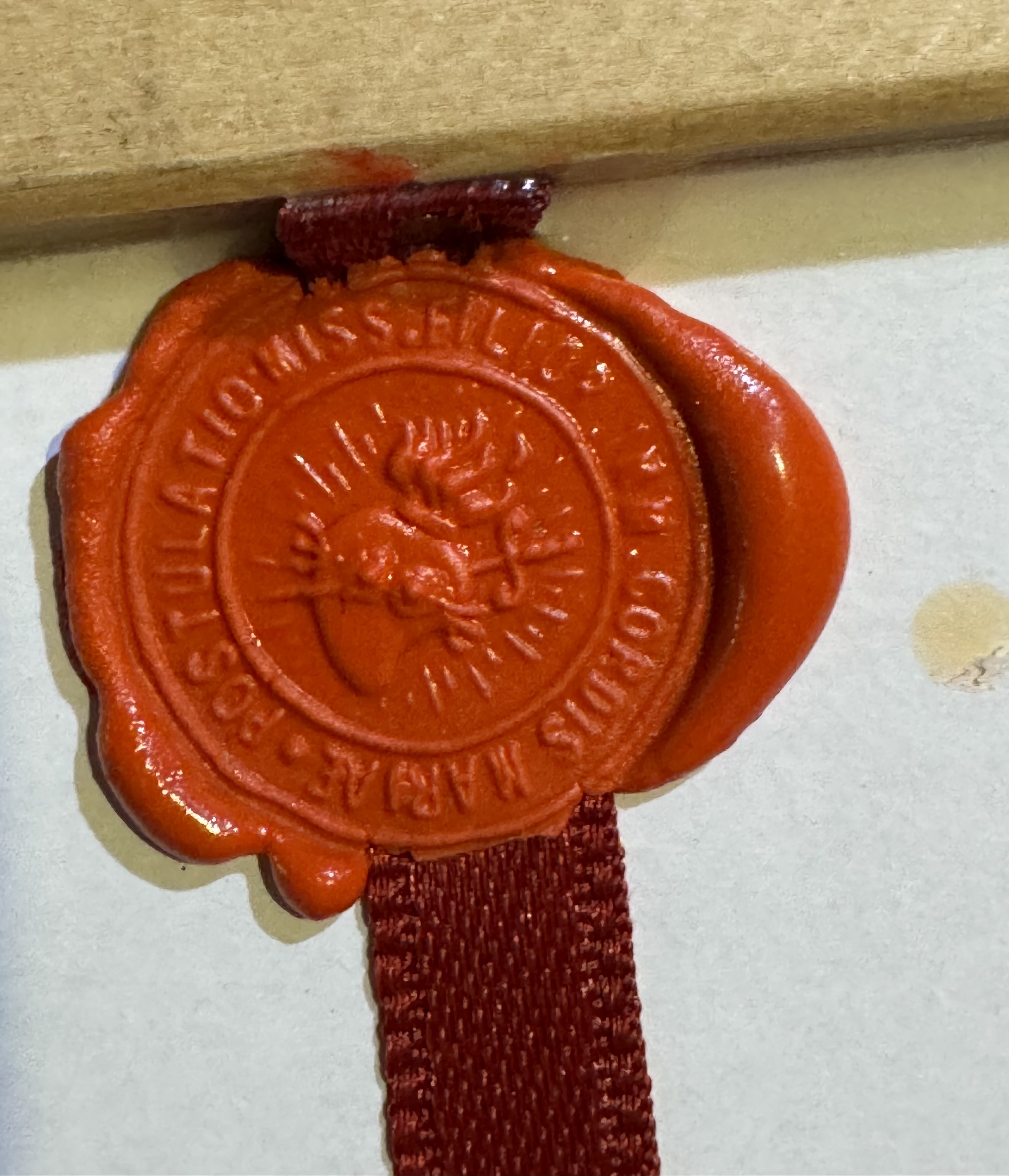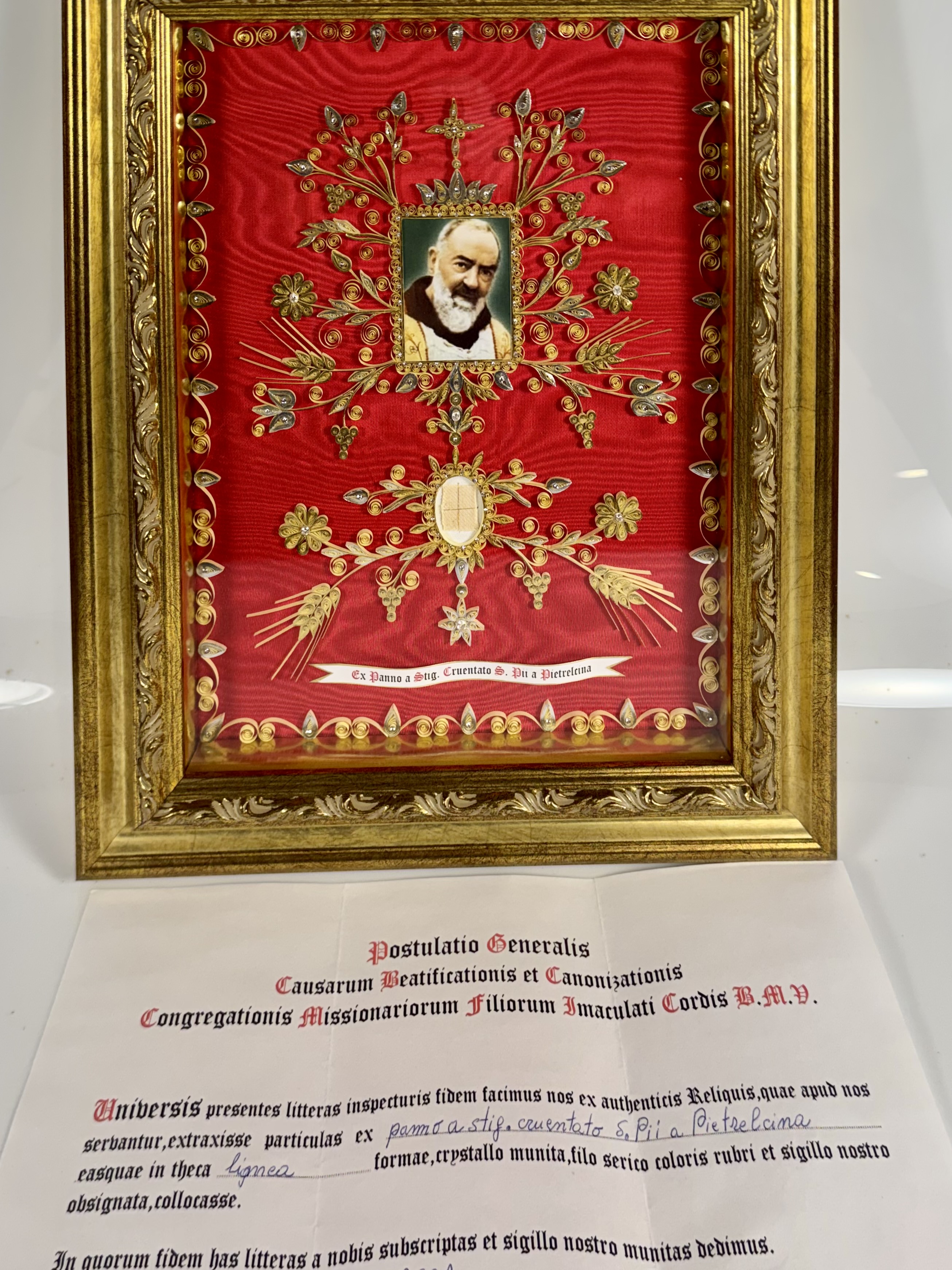 Large gilt wood glass-fronted reliquary frame housing the first-class ex panno a stigmatibus cruentato (from a cloth bloodied by the stigmata) relics of St. Padre Pio. A very large fragment of the cloth relic is affixed under a portrait of the Saint to a red silk ground profusely decorated with an elaborate gilt paperolle ornamentation and identified in Latin on a typeset cedula label as Ex Panno a Stig. Cruentato S. Pii a Pietrelcina (from a cloth bloodied by the stigmata of Saint Pio of Pietrelcina). On the back, the frame is secured with a crisscrossed red silk ribbon, held in place by four seals of red Spanish wax bearing an imprint of a coat of arms of the Congregation of Missionary Sons of the Immaculate Heart of the Blessed Virgin Mary (Known as the Claretian Missionaries). The relic is accompanied by the original matching authentics document issued by the Postulator General of the Order on June 16, 2002 - on the very day of his canonization.