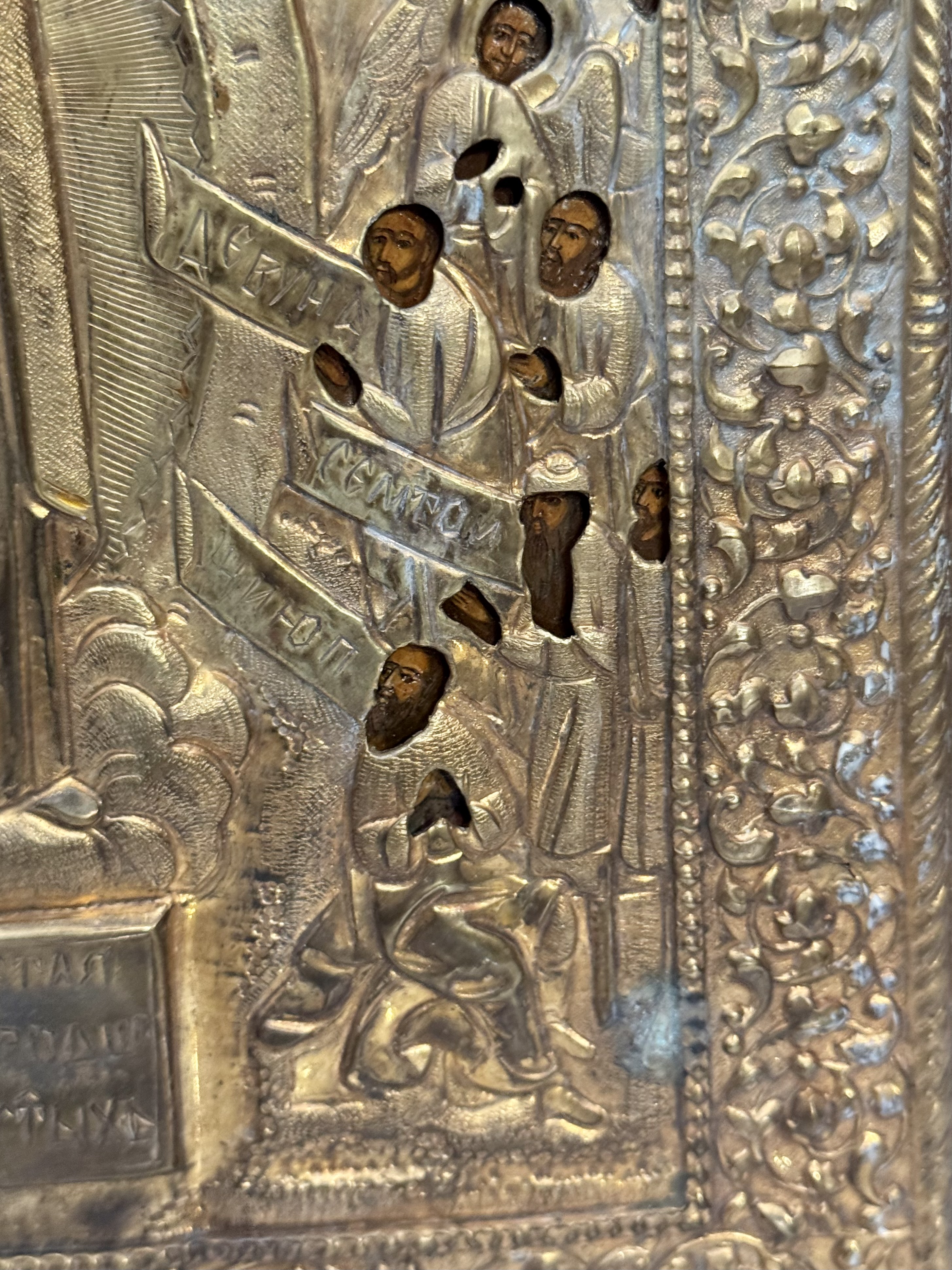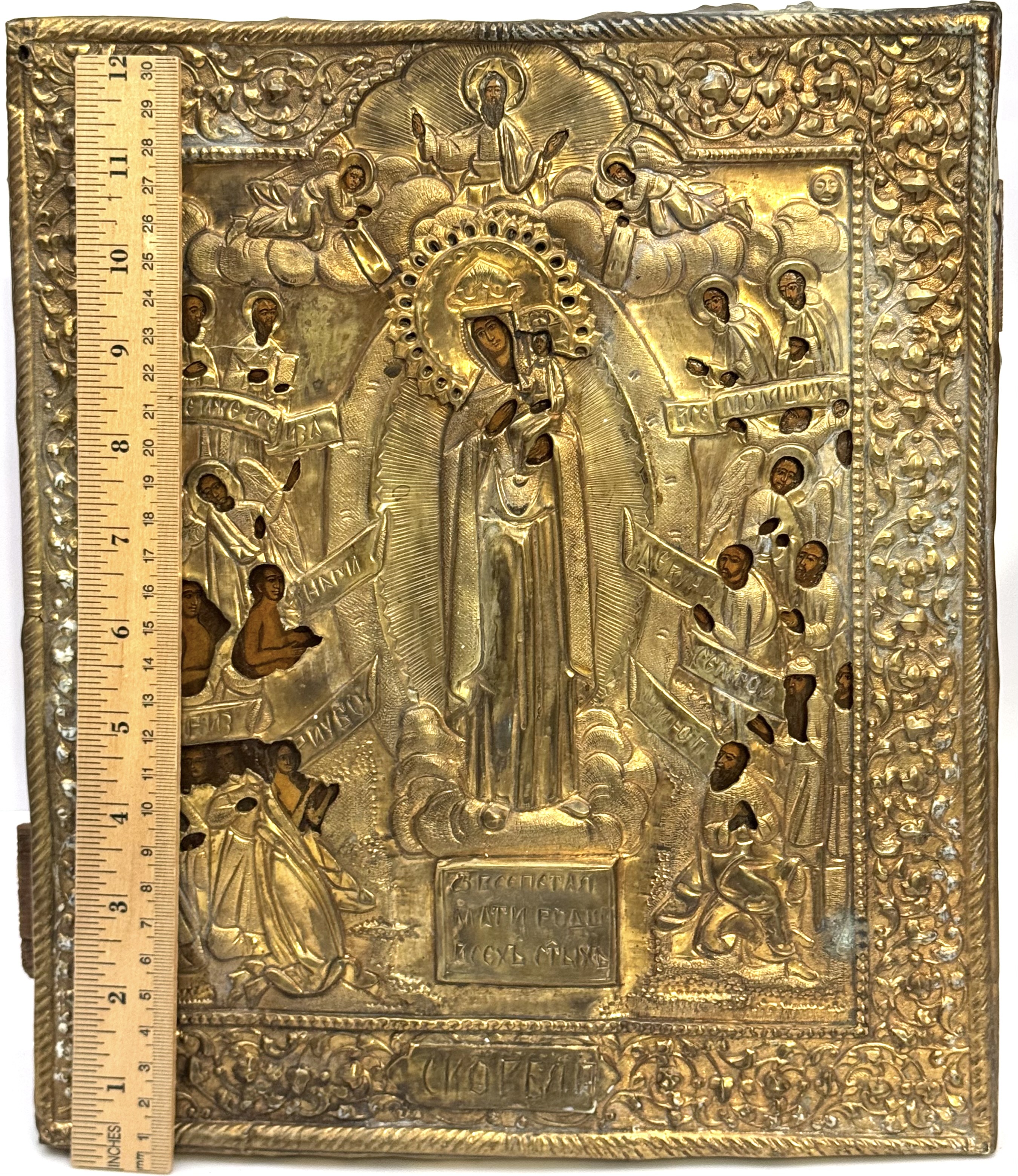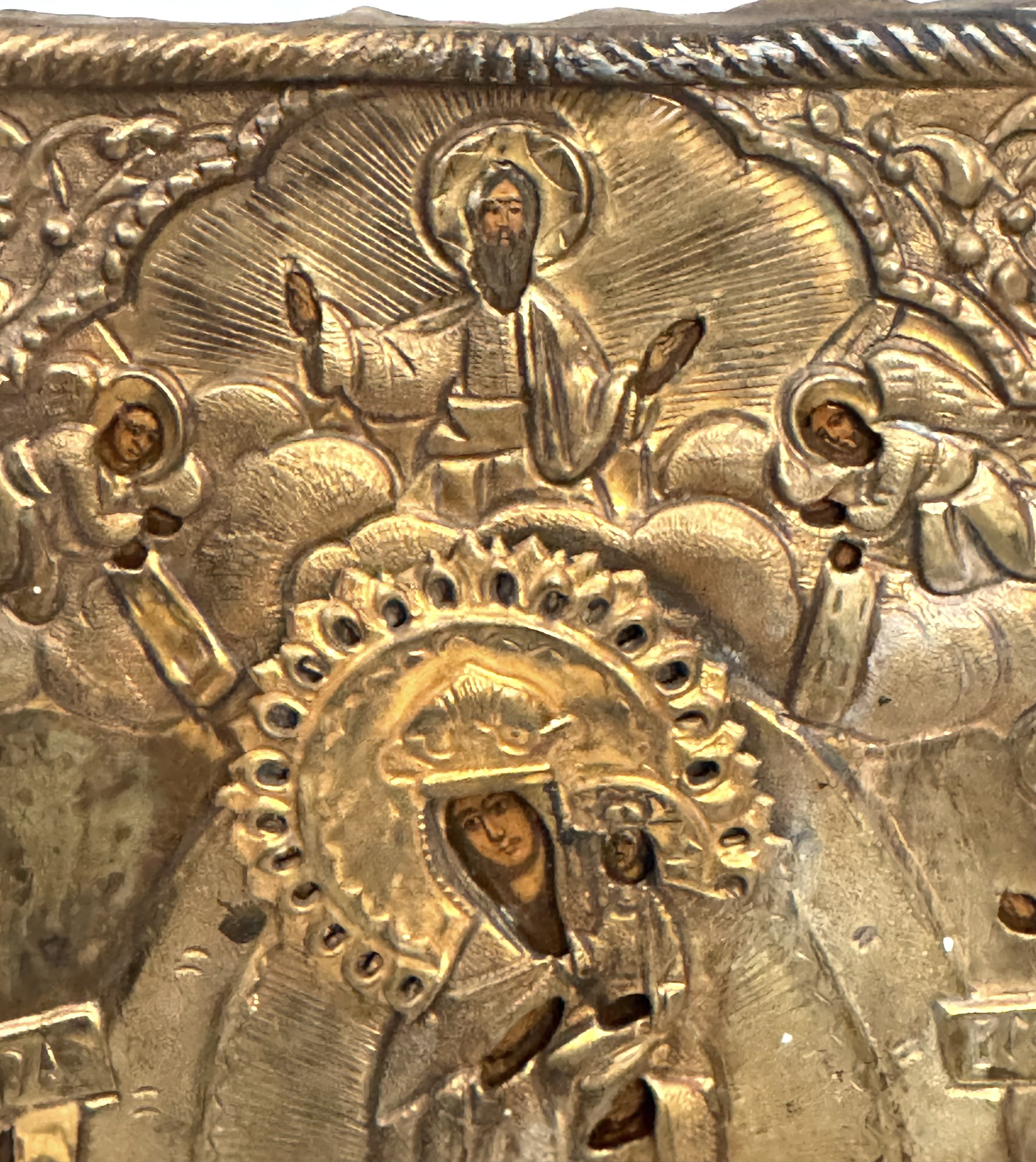 Mother of God, Joy to All Who Sorrow of Moscow is the name of a famous wonderworking Russian Orthodox icon. The icon dates to a miracle that occurred on October 24, 1688, when a woman named Euphemia received healing from sickness after obeying a voice telling her to find this icon and have the priest celebrate a prayer with the blessing of water. The design of this icon depicts the Mother of God, depicted full-figured, standing with her Son in Heaven and God the Father above her in the clouds. Along both sides of the icon, framing the Mother of God, depicted are many suppliants asking for her intercession. The tenderness and kindness of a loving mother are evident in her face as She stands in paradise and yet among us.