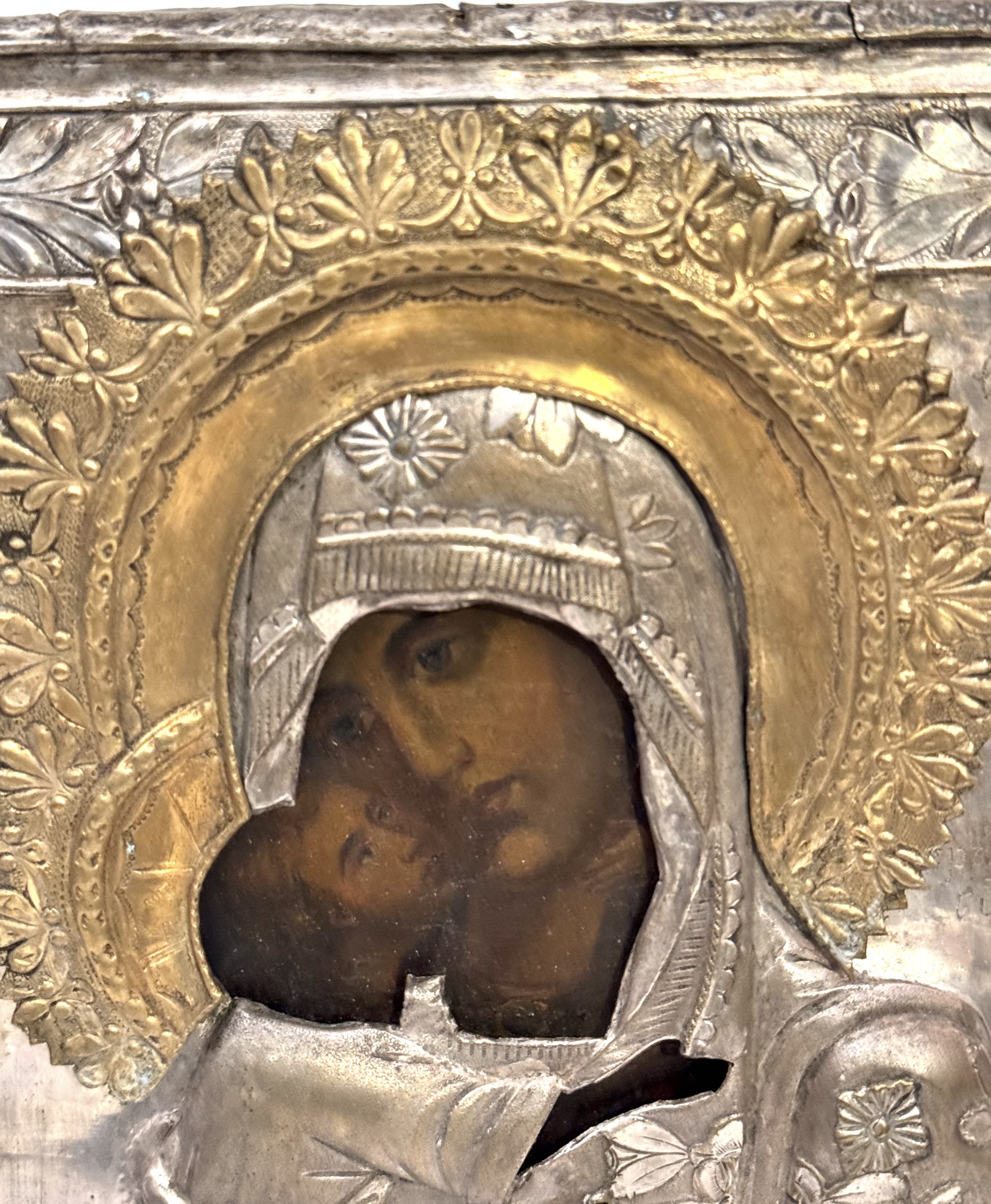 Our Lady of Vladimir is one of the most highly venerated Orthodox icons and a typical example of Byzantine iconography. The original 12th-century icon survived and is displayed in the Tretyakov Gallery museum in Moscow. Even more than most famous icons, the original has been copied repeatedly for centuries and many copies now have considerable artistic and religious significance of their own. The icon is a version of the Eleusa (Tenderness) type, with the Christ child snuggling up to his mother's cheek. The venerated image was used to celebrate the coronations of tsars, the elections of patriarchs, and other important ceremonies of the Russian state. Her feast day is June 3.