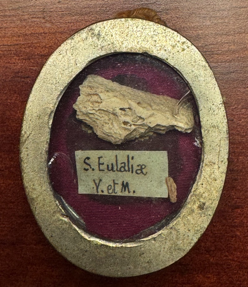 Saint Eulalia (Aulaire, Aulazia, Olalla, Eulària) (†303), co-patron saint of Barcelona, was a 13-year-old Roman Christian virgin who suffered martyrdom in Barcelona during the persecution of Christians in the reign of emperor Diocletian. For refusing to recant her Christianity, the Romans subjected her to thirteen tortures; including: putting her into a barrel with knives stuck into it and rolling it down a street, cutting off her breasts, crucifixion on an X-shaped cross, and finally, decapitation. Her feast day is commemorated on February 12 (August 22 in the Orthodox Church)