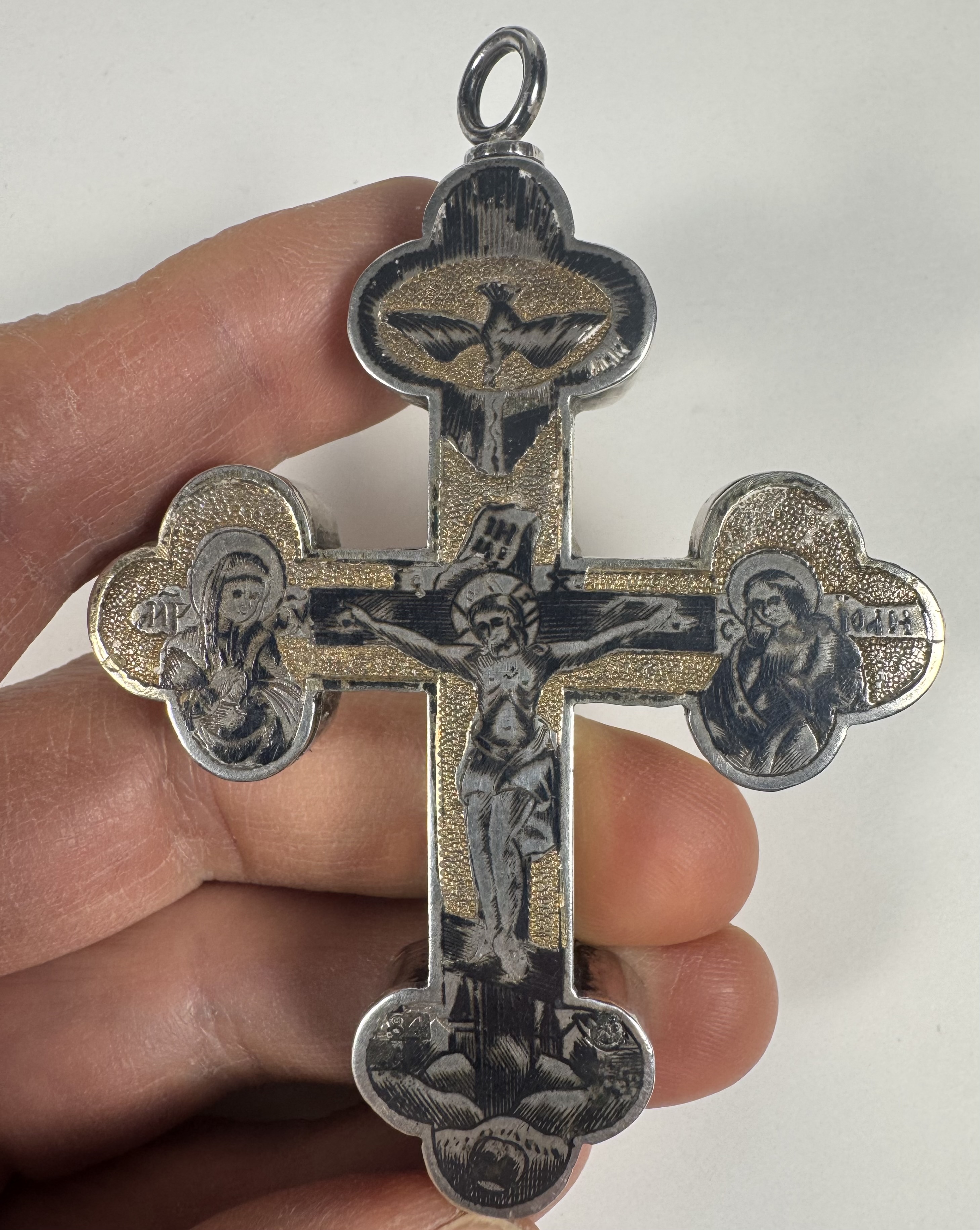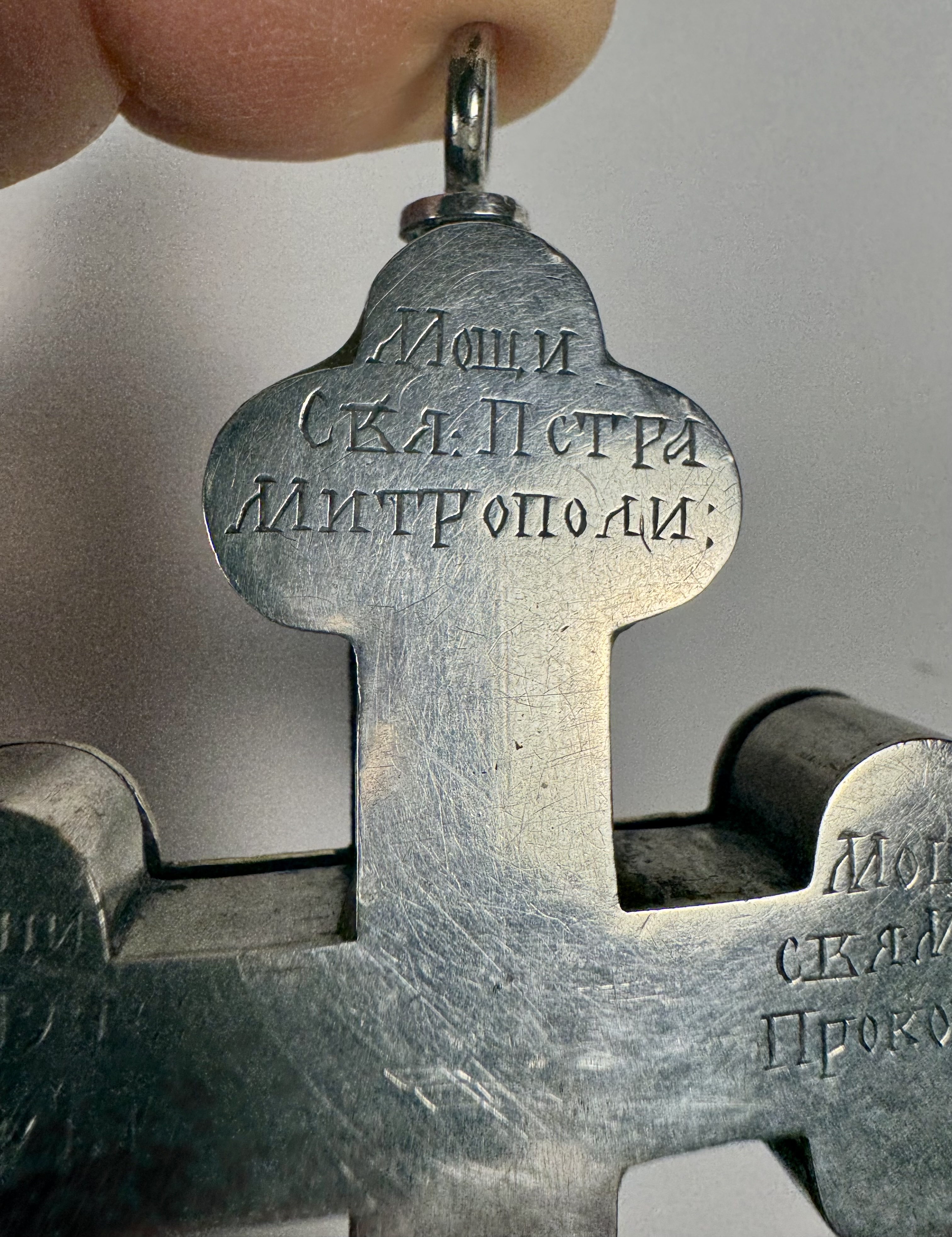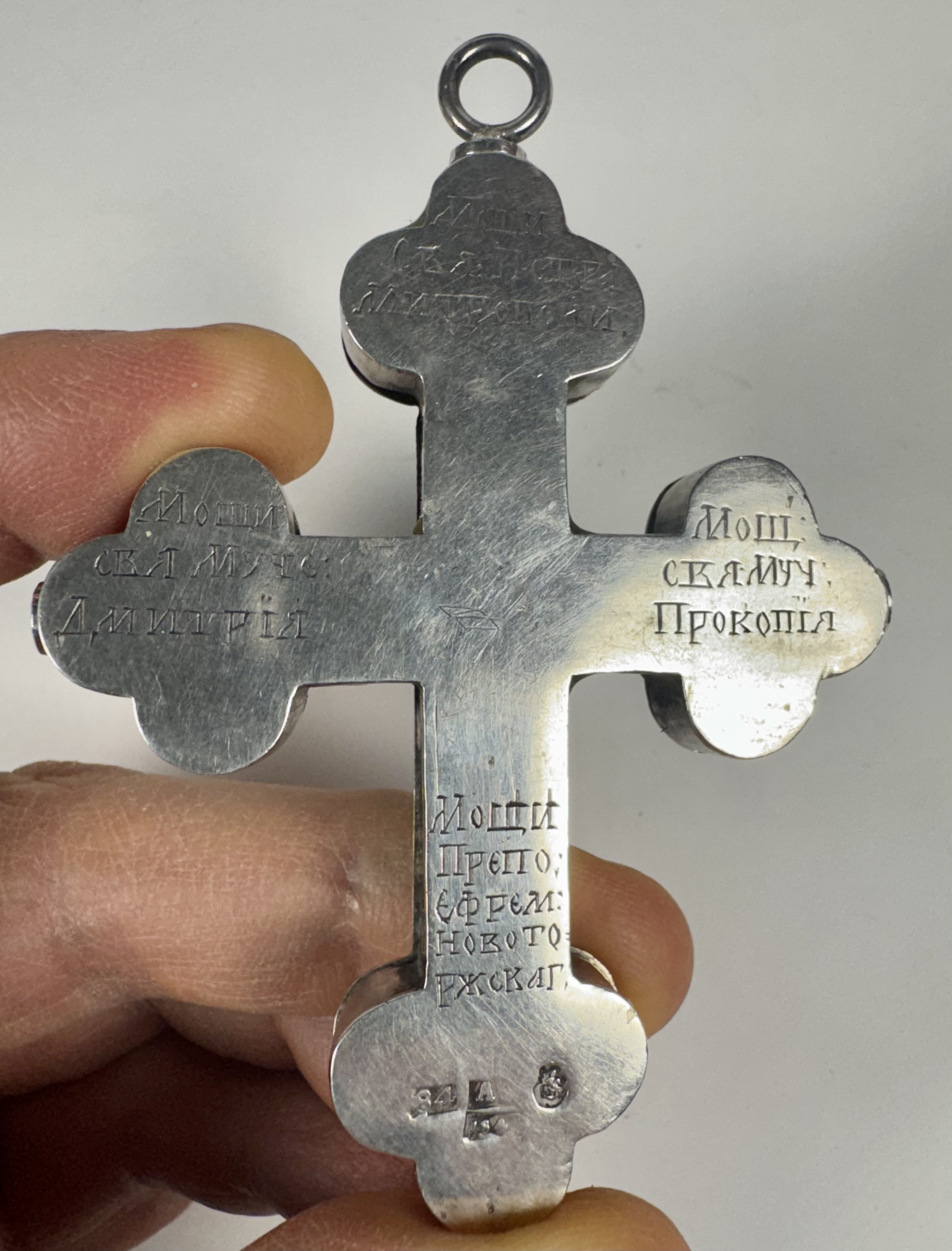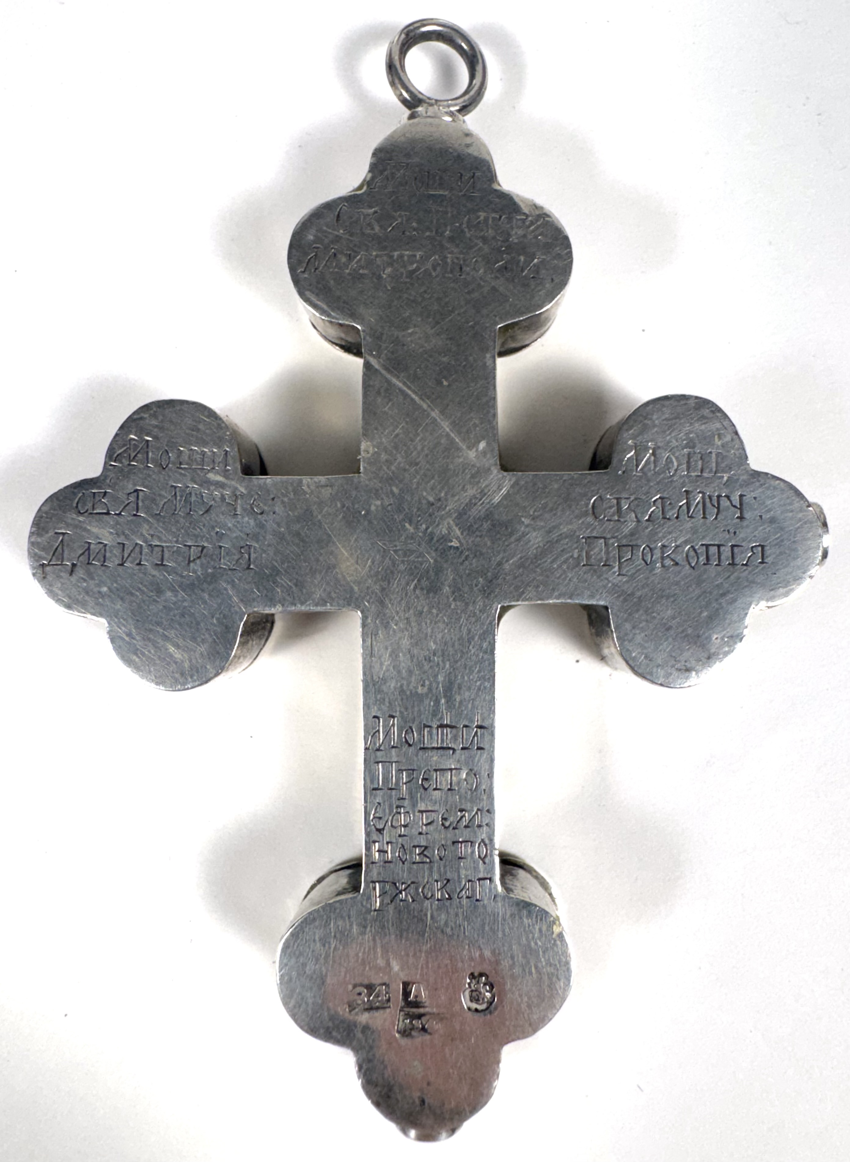 Редкий православный серебряный мощевик-реликварий в форме наперсного креста, украшенный на лицевой стороне искусно выполненной позолоченной и черненой сценой Распятия, по бокам которой изображены Пресвятая Богородица и святой Иоанн Богослов, а сверху - Святой Дух в виде голубя. Внутри мощевика хранятся мощи четырех значимых православных святых: святого великомученика Димитрия Солунского, святого Петра, митрополита Московского, святого мученика Прокопия Скифопольского и преподобного Ефрема Новоторжского, основателя Борисоглебского монастыря. На оборотной стороне мощевика надписи на старославянском языке: МОЩИ СВЯ: ПЕТРА МИТРОПОЛИ: (Мощи святого Петра, митрополита [Московского]) / МОЩИ СВЯ МУЧЕ ДМИТРIЯ (Мощи святого мученика Димитрия) / МОЩ: СВЯ МУЧ ПРОКОПIЯ (Мощи святого мученика Прокопия) / МОЩИ ПРЕПО: ЕФРЕМ: НОВОТОРЖСКАГО (Мощи преподобного Ефрема Новоторжского). Как лицевая, так и оборотная стороны мощевика имеют московское пробирное клеймо, и дату на оборотной стороне — 184?.