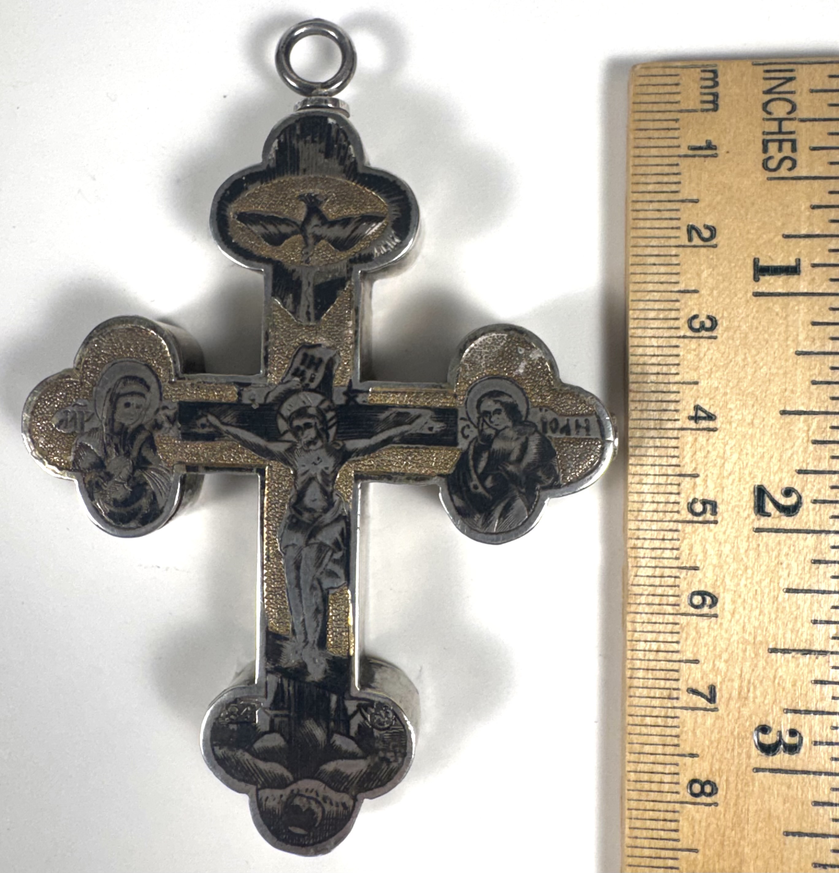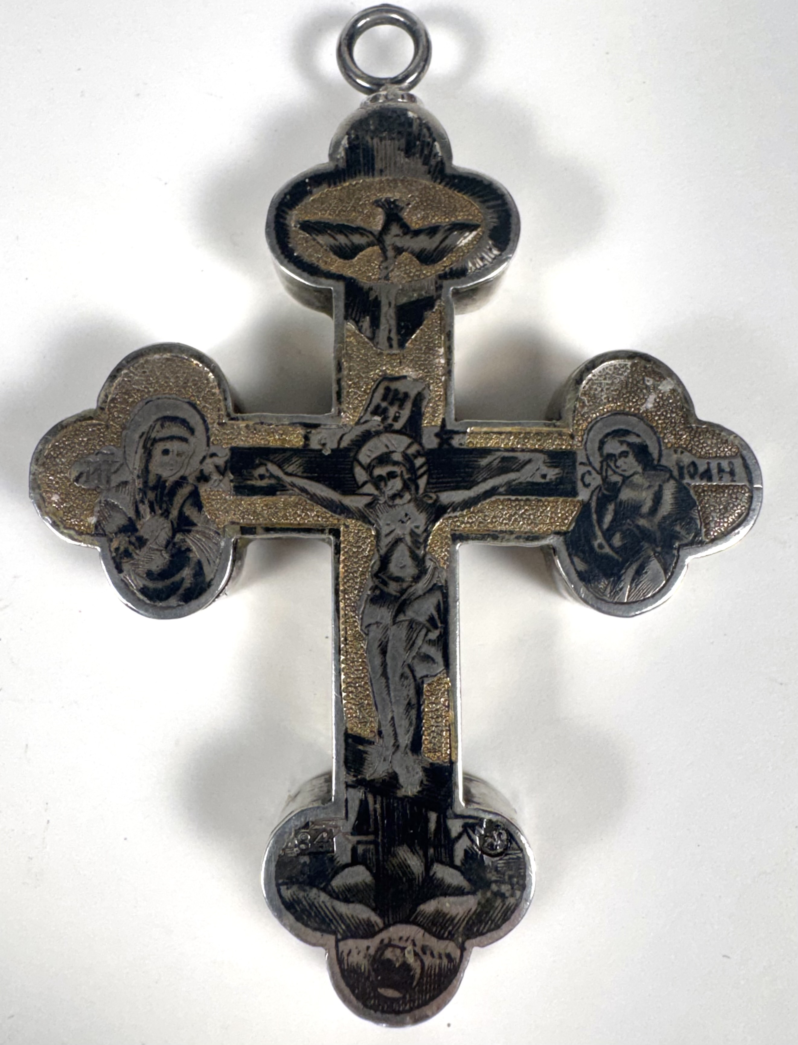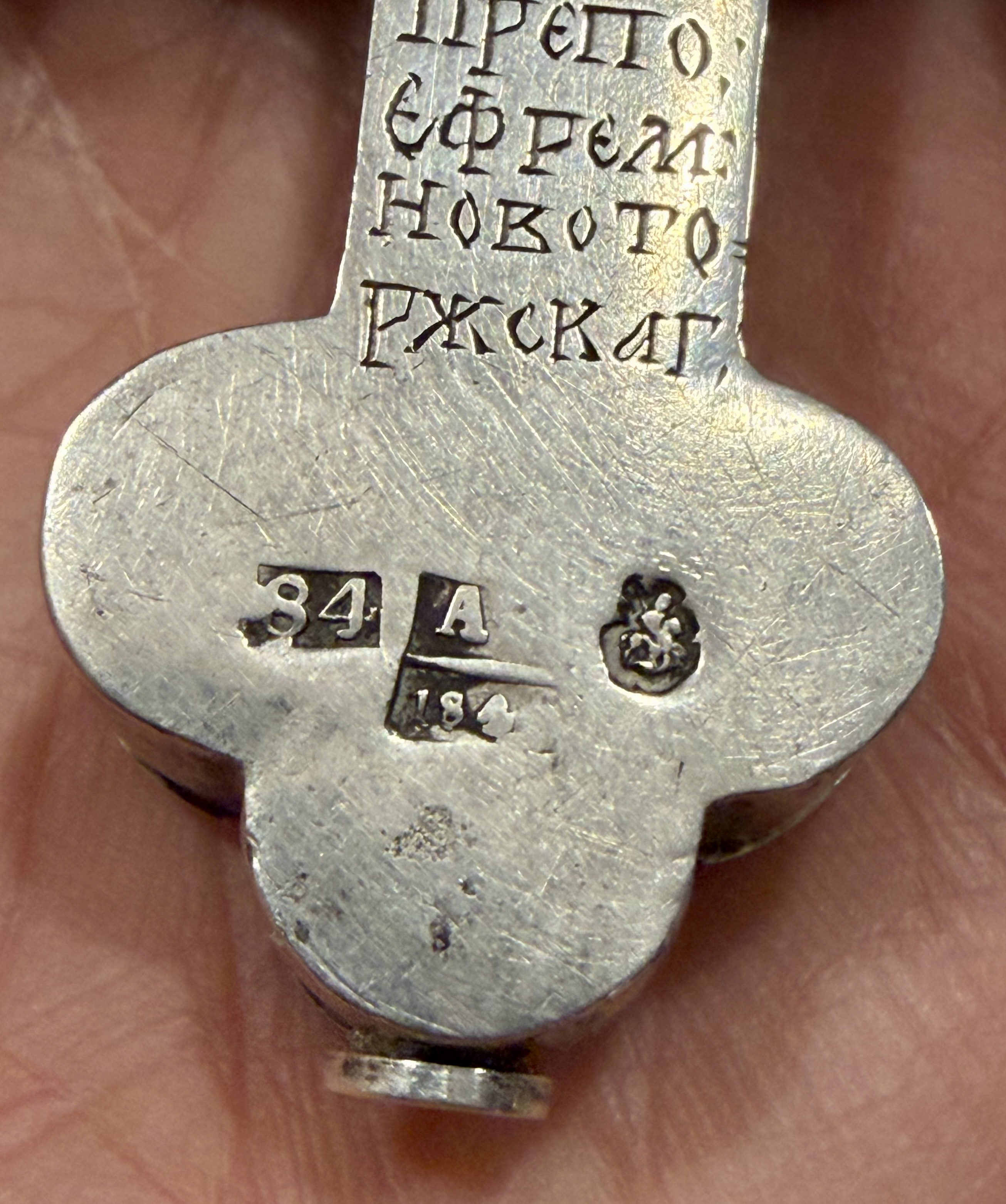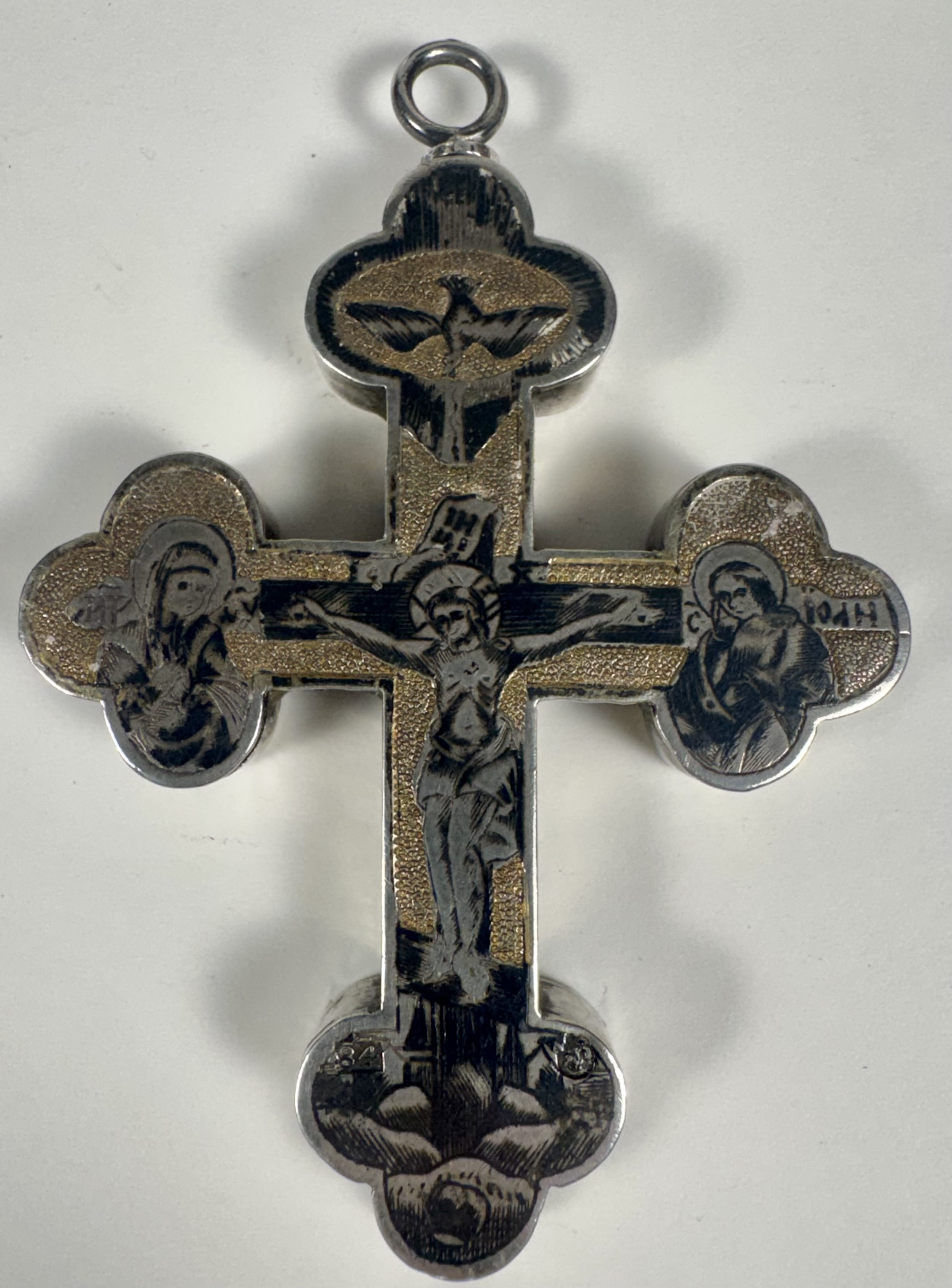 Редкий православный серебряный мощевик-реликварий в форме наперсного креста, украшенный на лицевой стороне искусно выполненной позолоченной и черненой сценой Распятия, по бокам которой изображены Пресвятая Богородица и святой Иоанн Богослов, а сверху - Святой Дух в виде голубя. Внутри мощевика хранятся мощи четырех значимых православных святых: святого великомученика Димитрия Солунского, святого Петра, митрополита Московского, святого мученика Прокопия Скифопольского и преподобного Ефрема Новоторжского, основателя Борисоглебского монастыря. На оборотной стороне мощевика надписи на старославянском языке: МОЩИ СВЯ: ПЕТРА МИТРОПОЛИ: (Мощи святого Петра, митрополита [Московского]) / МОЩИ СВЯ МУЧЕ ДМИТРIЯ (Мощи святого мученика Димитрия) / МОЩ: СВЯ МУЧ ПРОКОПIЯ (Мощи святого мученика Прокопия) / МОЩИ ПРЕПО: ЕФРЕМ: НОВОТОРЖСКАГО (Мощи преподобного Ефрема Новоторжского). Как лицевая, так и оборотная стороны мощевика имеют московское пробирное клеймо, и дату на оборотной стороне — 184?.