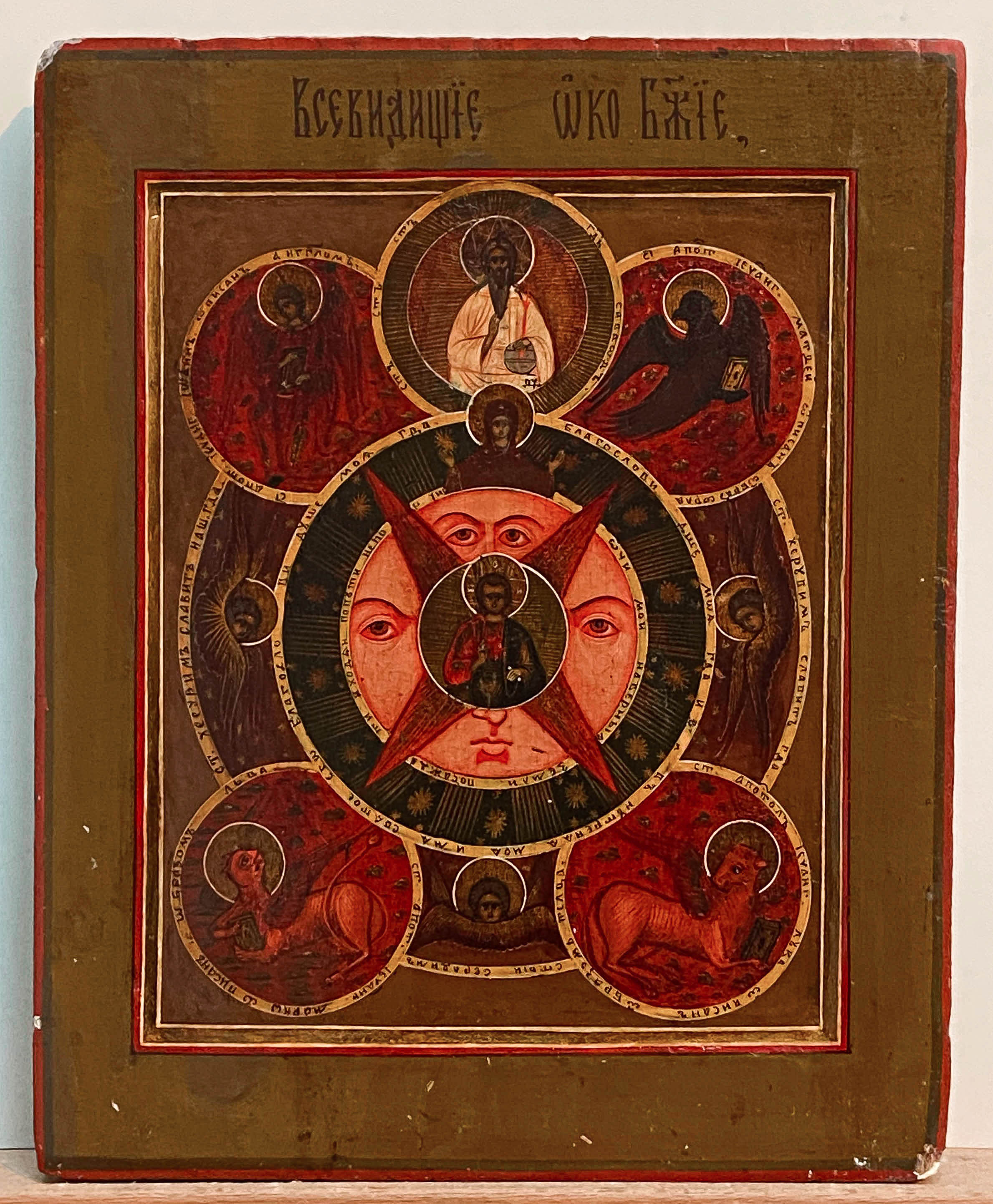 At the heart of the composition of such icons is the recurring motif of circles. In the central red circle, Jesus Christ is depicted in the iconographic image of the Saviour Emmanuel with a blessing gesture. From this circle on the diagonal proceed 4 rays, on their tops are 4 small circles, inside of which are the allegorical symbols of the evangelists. Above the central circle on the central axis depicted the Virgin Mary with arms raised. The next circle is representing the sky with stars. The outermost circle depicts seraphim. Above it on the central axis is a truncated circle, in which the heaven with God the Father with a gesture of blessing is depicted.