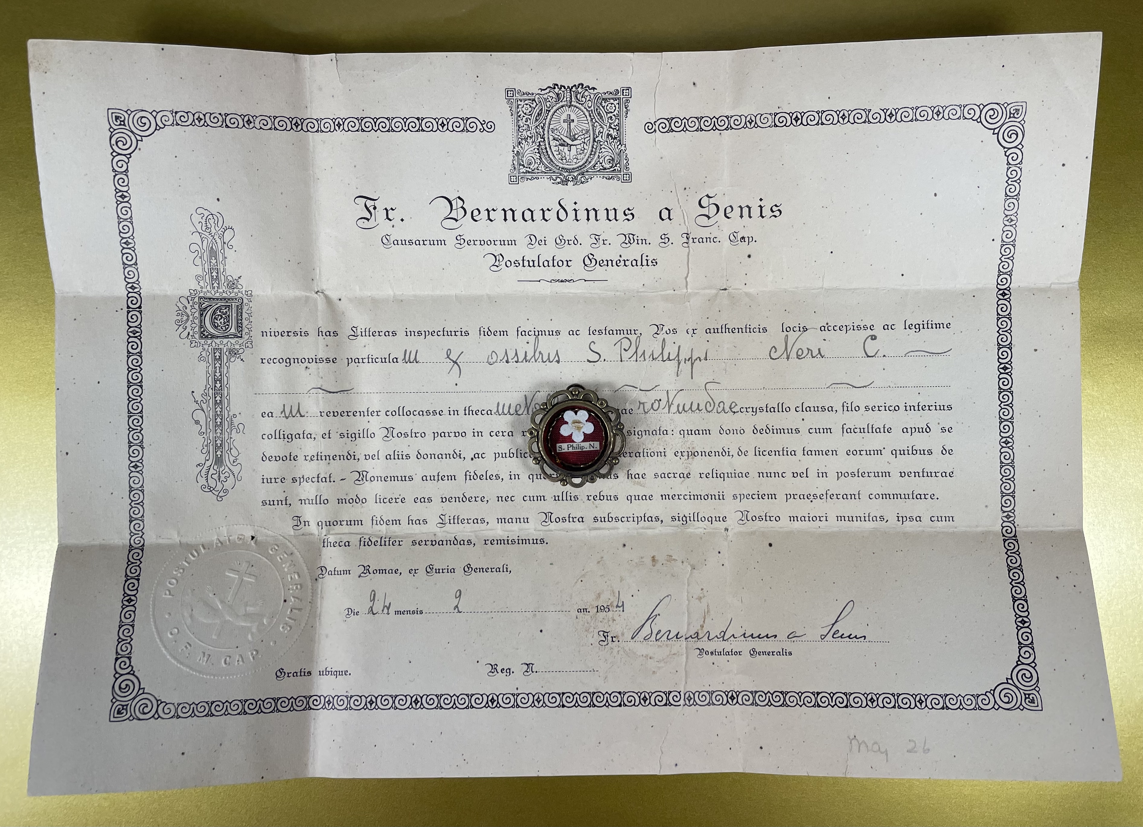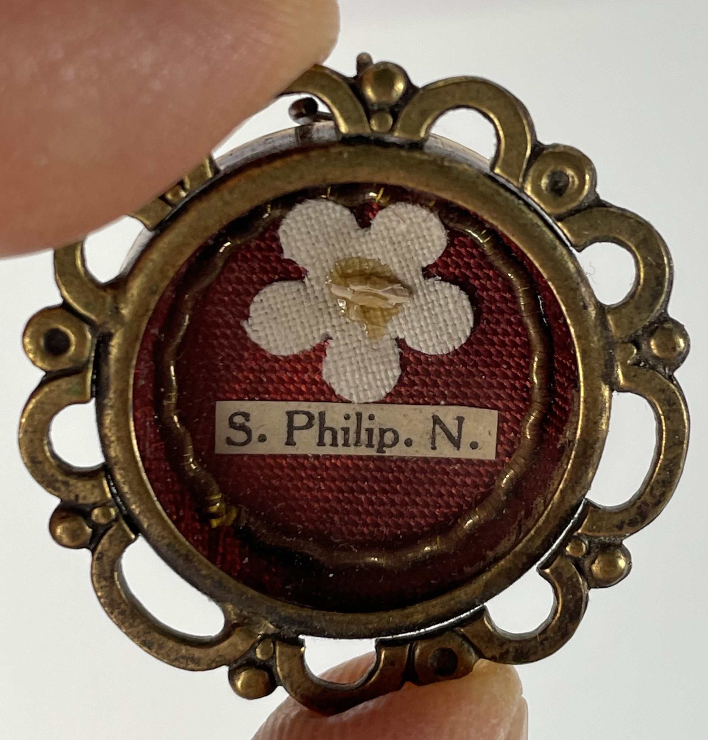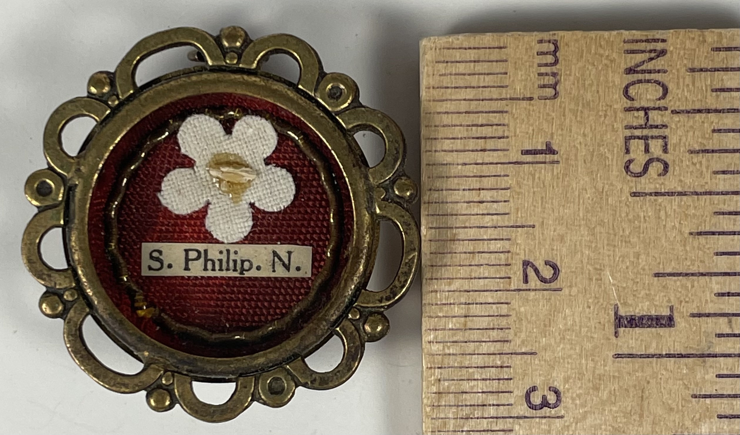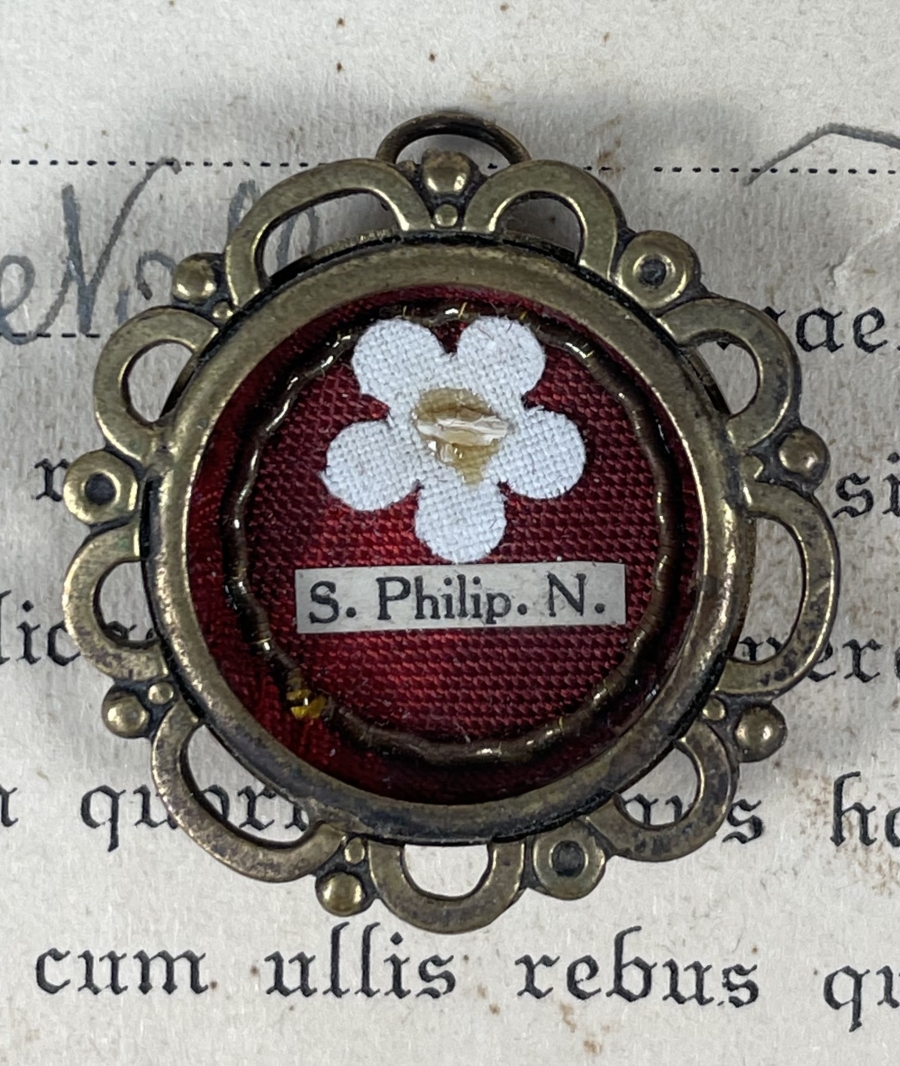 Round white-metal glass-fronted reliquary theca housing the first-class ex ossibus  (of the bone) relic of the Saint Philip Romolo Neri. The relic is affixed to a red silk ground and identified in Latin on a typeset cedula label as S. Philip N. (St. Philip Neri).  On the back, under a protective cap, the theca is secured with a seal of red Spanish wax bearing an imprint of a coat of arms of the Order of Friars Minor. The relic is accompanied by the original matching authentics document issued and sealed in 1954 by Fr. Bernardinus a Senis, Postulator General of the Order.
