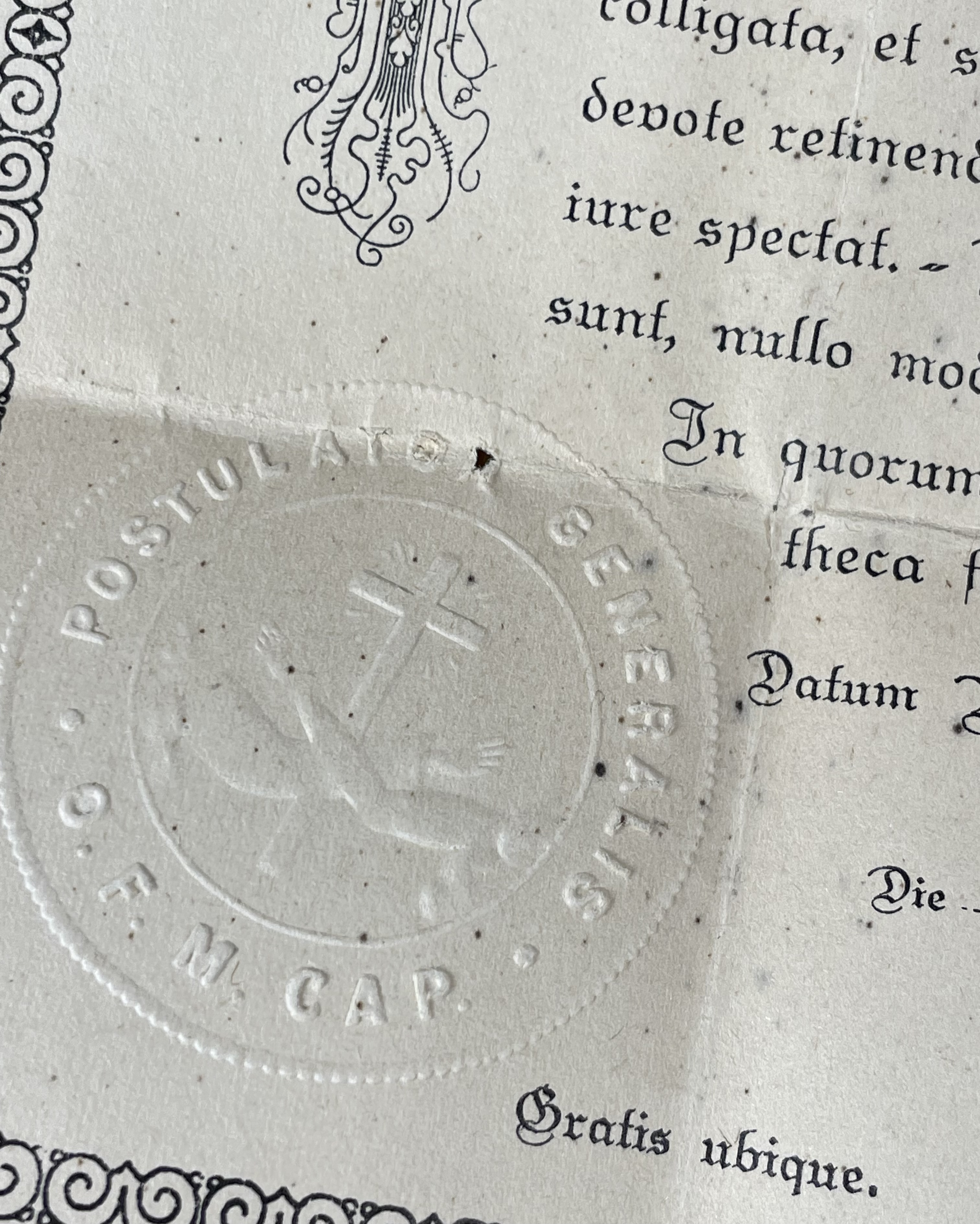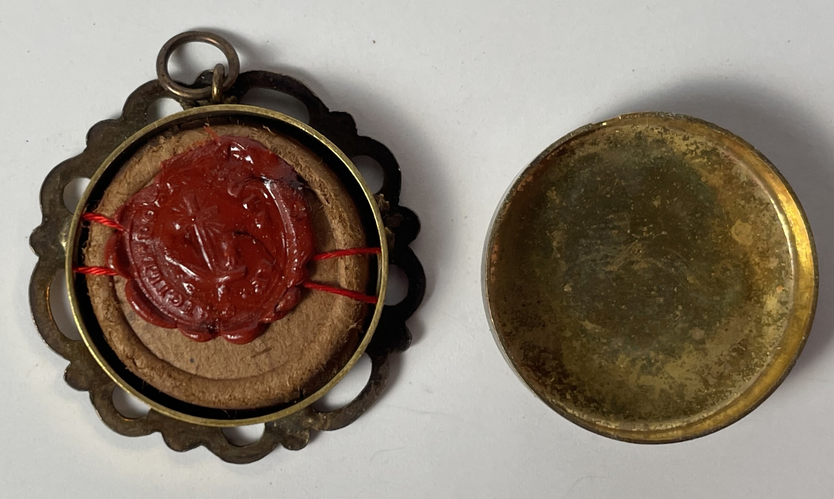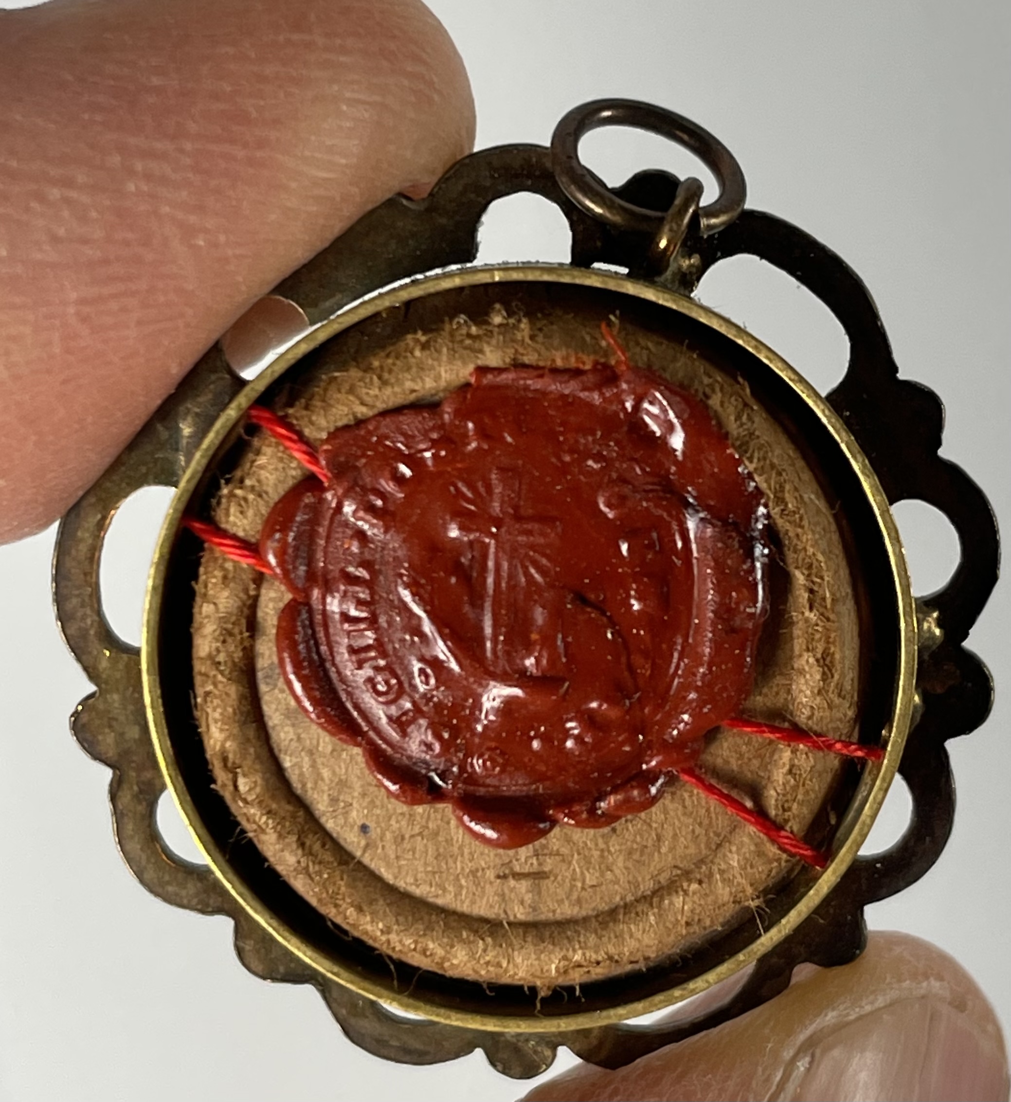 Round white-metal glass-fronted reliquary theca housing the first-class ex ossibus  (of the bone) relic of the Saint Philip Romolo Neri. The relic is affixed to a red silk ground and identified in Latin on a typeset cedula label as S. Philip N. (St. Philip Neri).  On the back, under a protective cap, the theca is secured with a seal of red Spanish wax bearing an imprint of a coat of arms of the Order of Friars Minor. The relic is accompanied by the original matching authentics document issued and sealed in 1954 by Fr. Bernardinus a Senis, Postulator General of the Order.