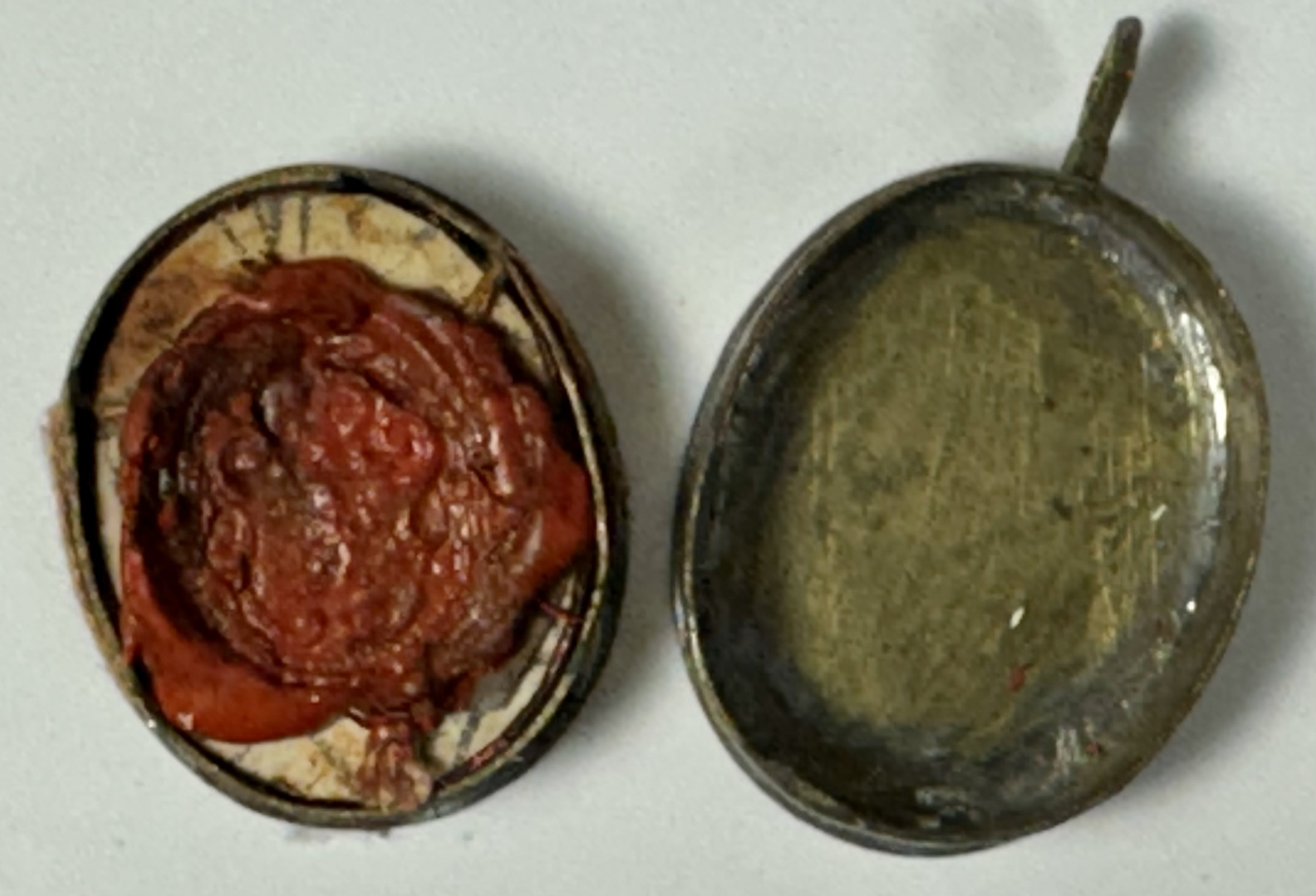 Oval brass glass-fronted pendant reliquary theca housing first-class ex ossibus (of the bone) relic of Saint Gorgonius of Nicomedia.The relic is affixed to a a red silk ground surrounded by gilt paperolle ornamentation and identified in Latin on a manuscript cedula label as S. Gorgonÿ, M. (Saint Gorgonius, Martyr). On the back, under a protective cap, the theca is secured with a perfectly preserved seal of red Spanish wax bearing an imprint with a coat of arms of Fr. Antonio Cantoni (†1781), Bishop of Faenza, Italy (1742–1767) and Archbishop of Ravenna, Italy (1767–1781).