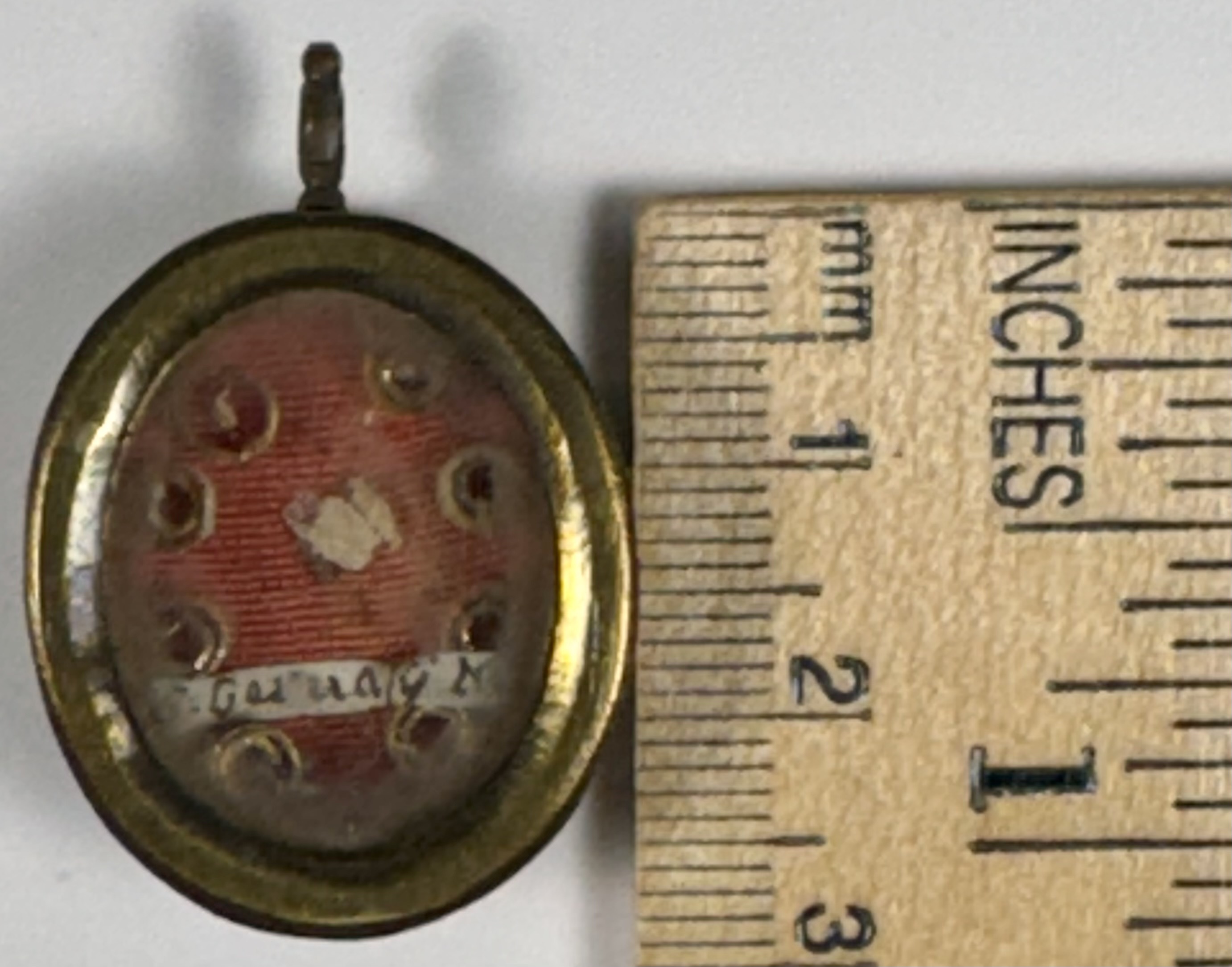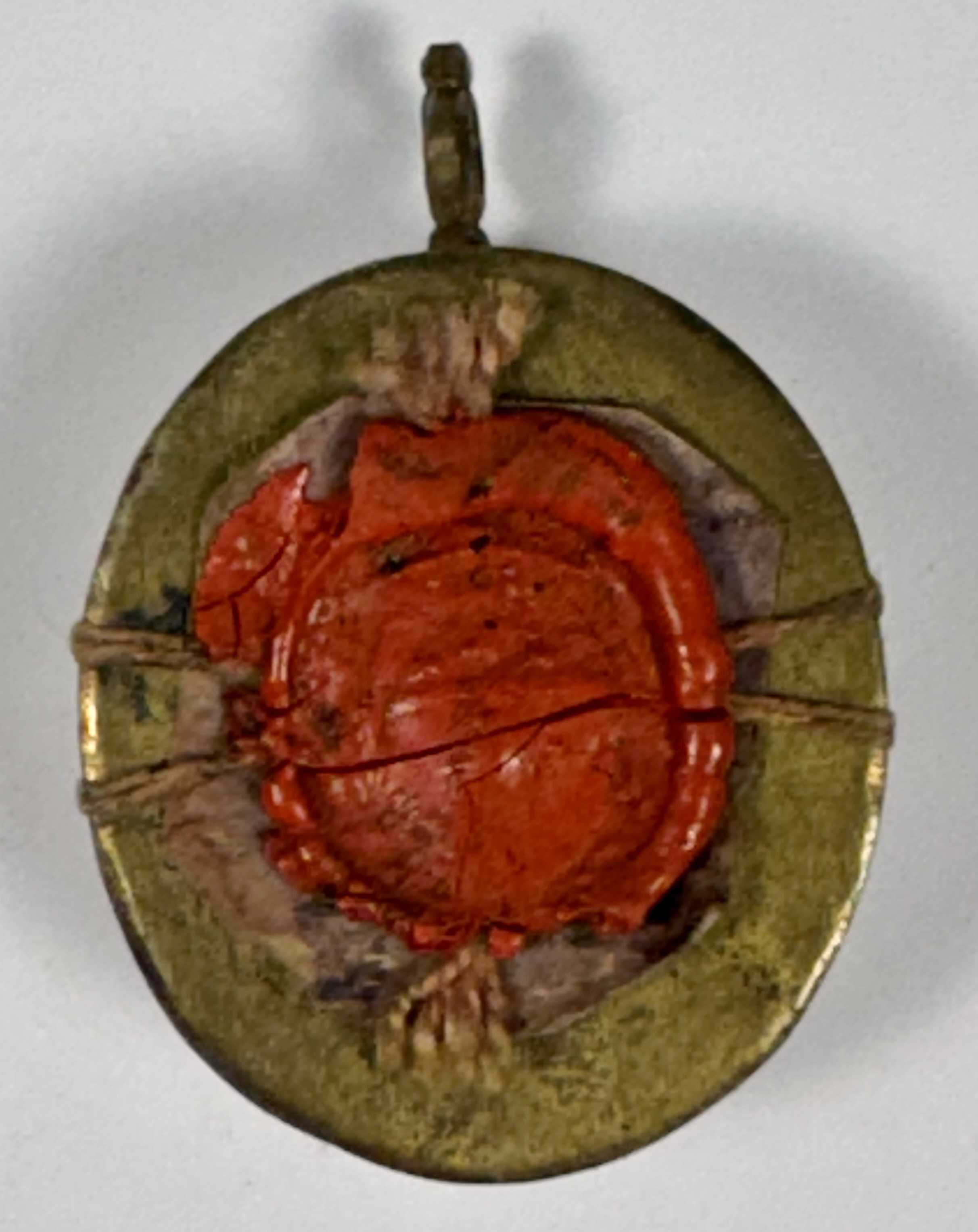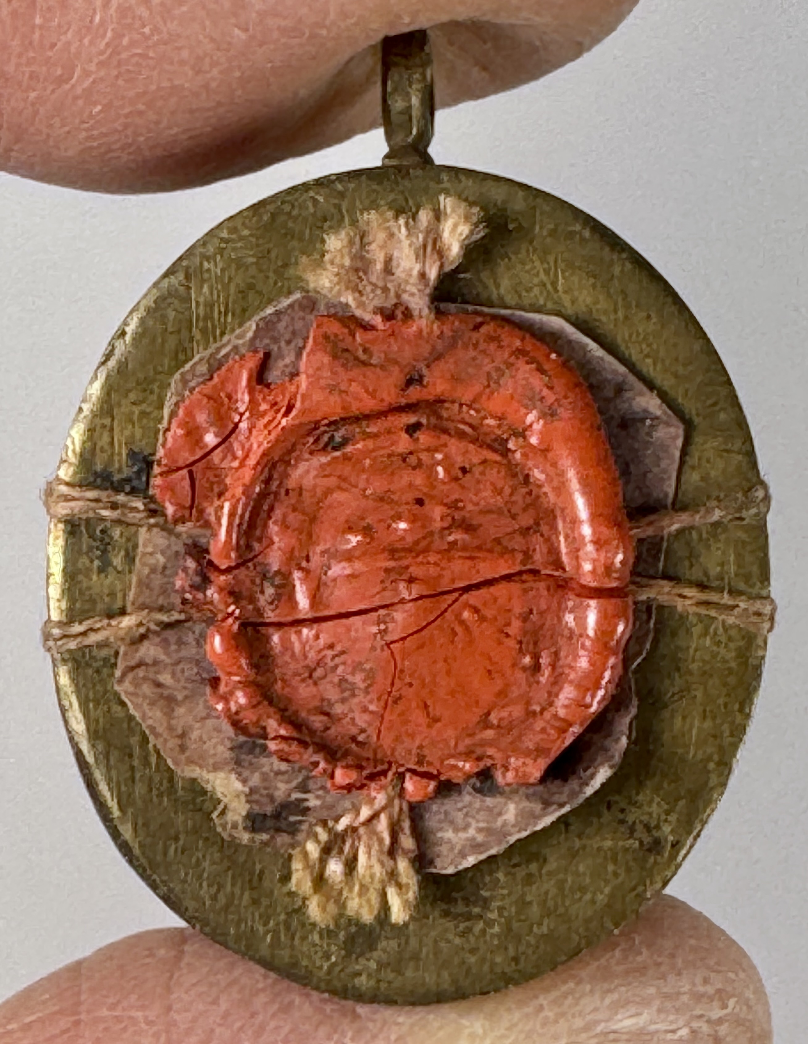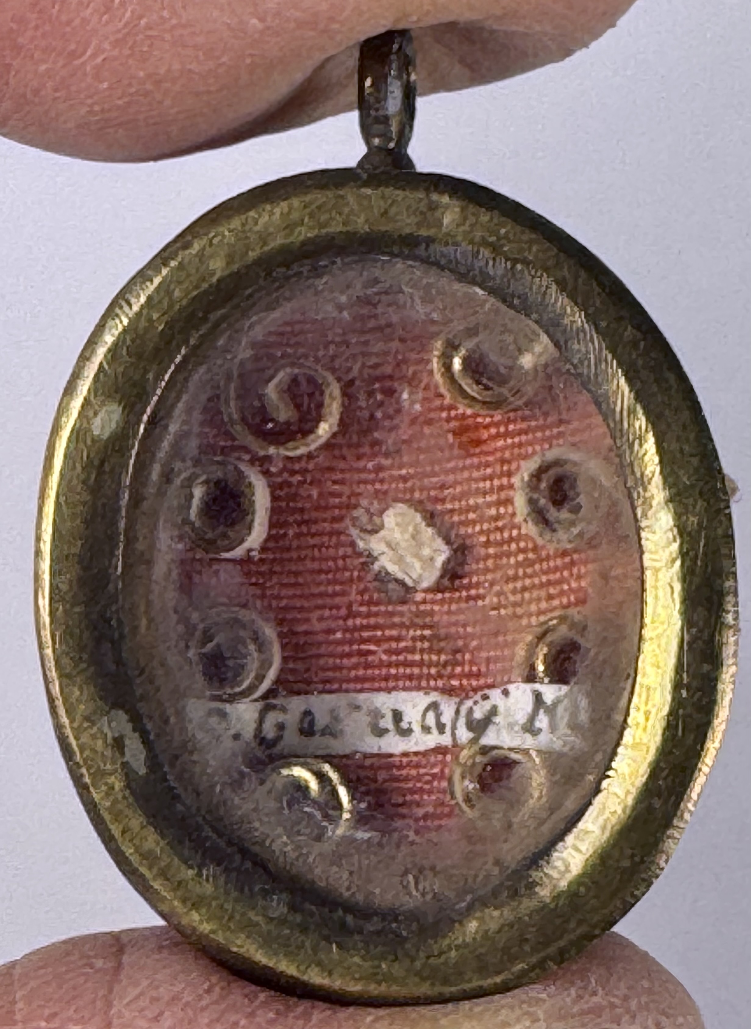 Oval glass-fronted brass reliquary theca housing first-class ex ossibus (of the bone) relic of Saints Gervasius. The relic is affixed to a red silk ground surrounded by gilt paperolle ornamentation and identified in Latin on a manuscript cedula label as S. Gerasÿ M. (Saints Gervasius, Martyr). On the back, the theca is secured with a perfectly preserved seal of red Spanish wax bearing an imprint with a coat of arms of Fr. Antonio Cantoni (†1781), Bishop of Faenza, Italy (1742–1767) and Archbishop of Ravenna, Italy (1767–1781).