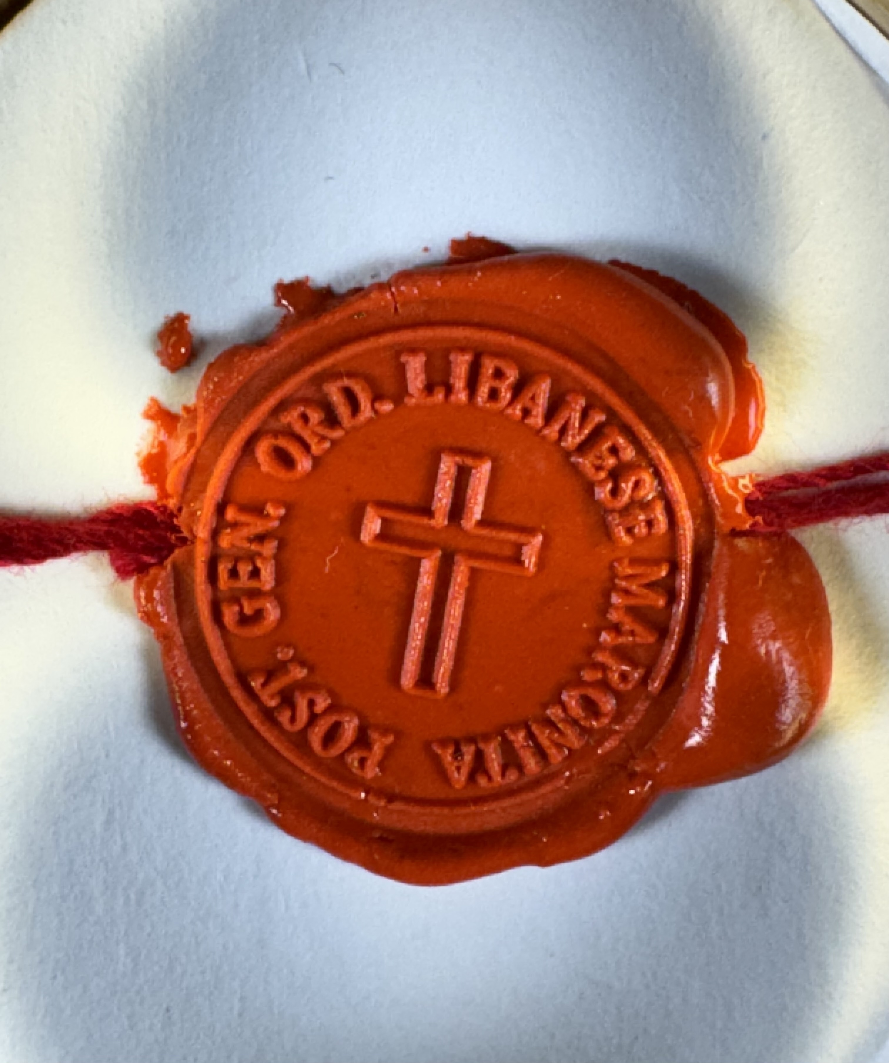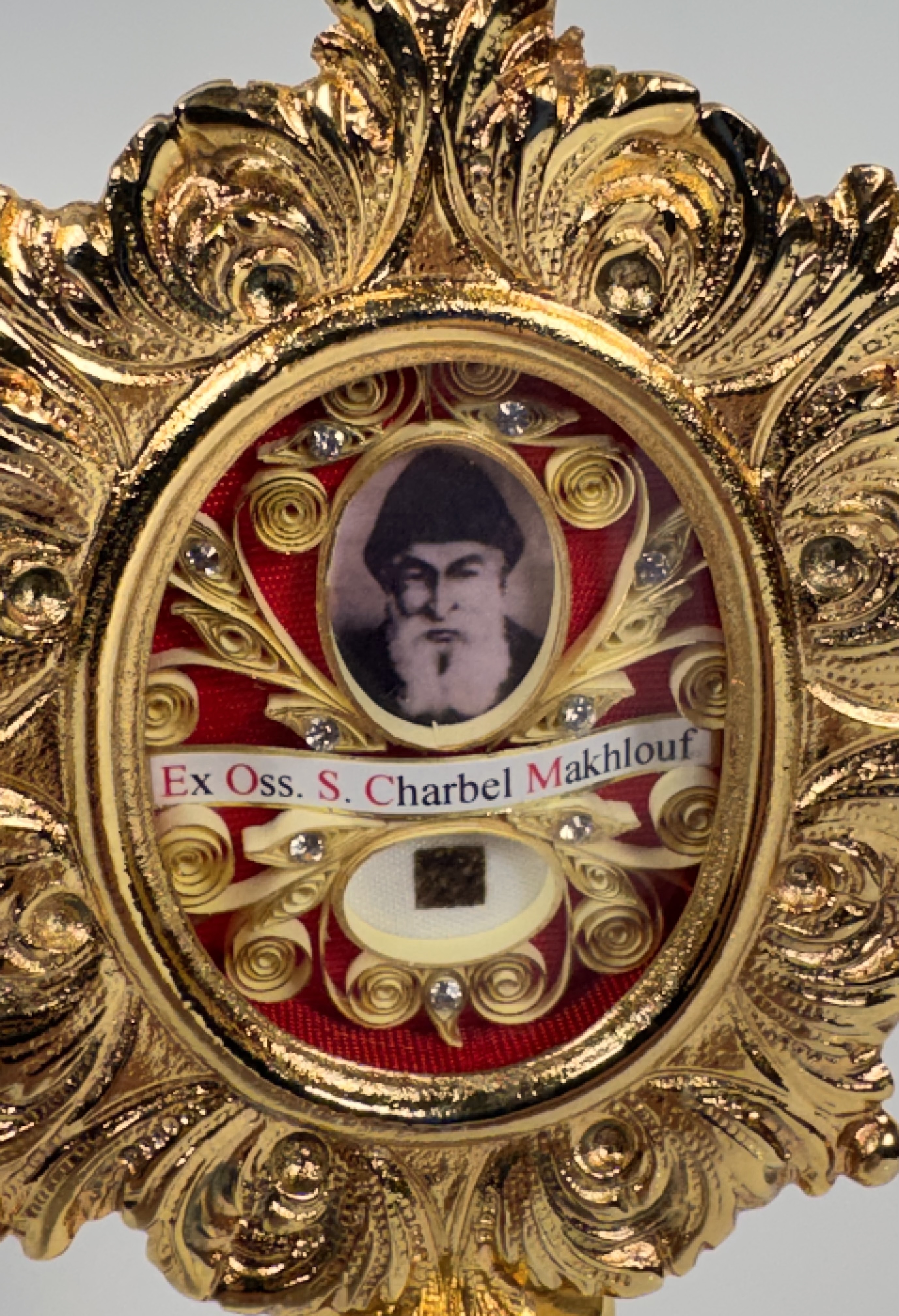 Attractive small glass-fronted gilt-metal reliquary monstrance housing the first-class ex ossibus (of the bone) relic of a Maronite Saint Charbel Makhlouf. Under a portrait of the Saint, a substantial relic is affixed to a red silk ground surrounded by paperole ornamentation and identified in Latin on a bi-color typeset cedula label as Ex Oss. S. Charbel Makhlouf(of the bone of Saint Charbel Makhlouf). On the back, under a protective cap, the reliquary is secured with a seal of red Spanish wax bearing an imprint of a coat of arms of the Postulator General of the Lebanese Maronite Order. The reliquary is accompanied by the matching authentics document issued and signed by the Postulator General on July 24th, 2005 (the day of his Feast).