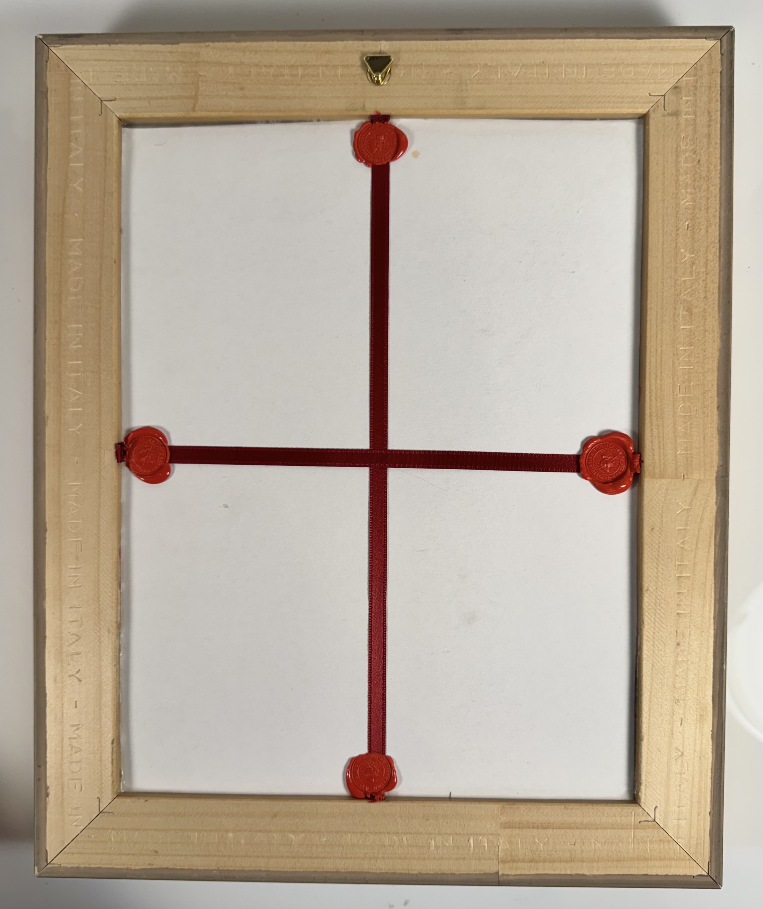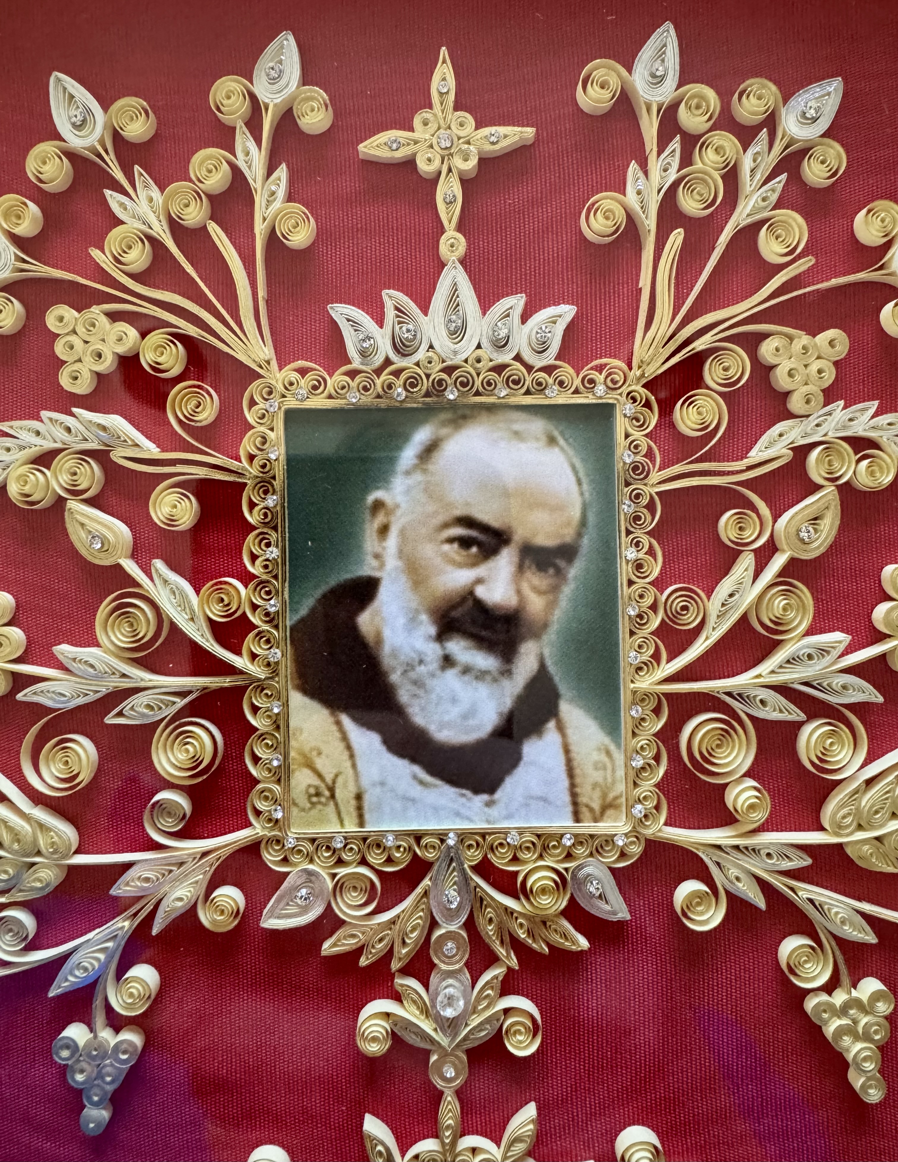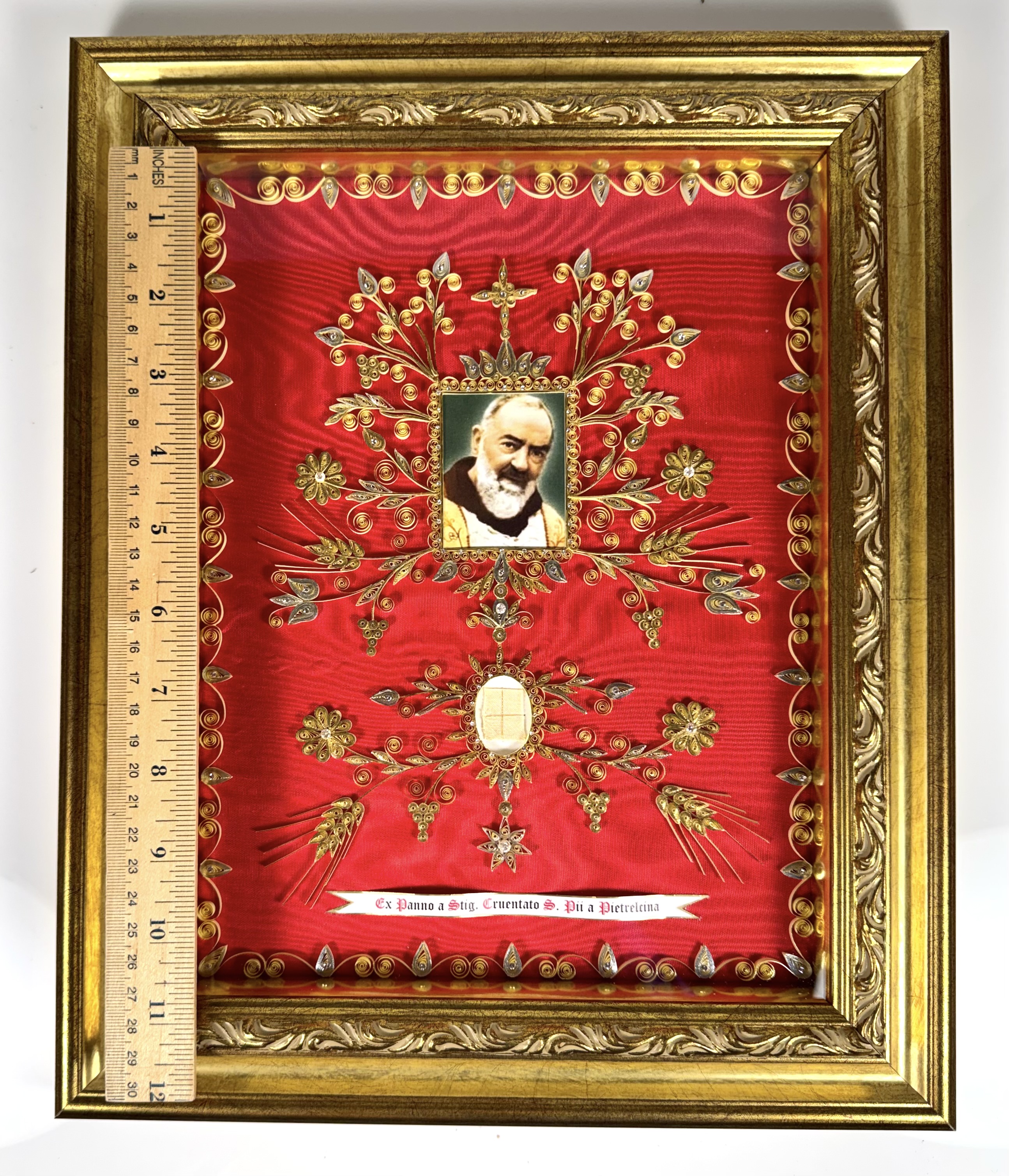 Large gilt wood glass-fronted reliquary frame housing the first-class ex panno a stigmatibus cruentato (from a cloth bloodied by the stigmata) relics of St. Padre Pio. A very large fragment of the cloth relic is affixed under a portrait of the Saint to a red silk ground profusely decorated with an elaborate gilt paperolle ornamentation and identified in Latin on a typeset cedula label as Ex Panno a Stig. Cruentato S. Pii a Pietrelcina (from a cloth bloodied by the stigmata of Saint Pio of Pietrelcina). On the back, the frame is secured with a crisscrossed red silk ribbon, held in place by four seals of red Spanish wax bearing an imprint of a coat of arms of the Congregation of Missionary Sons of the Immaculate Heart of the Blessed Virgin Mary (Known as the Claretian Missionaries). The relic is accompanied by the original matching authentics document issued by the Postulator General of the Order on June 16, 2002 - on the very day of his canonization.