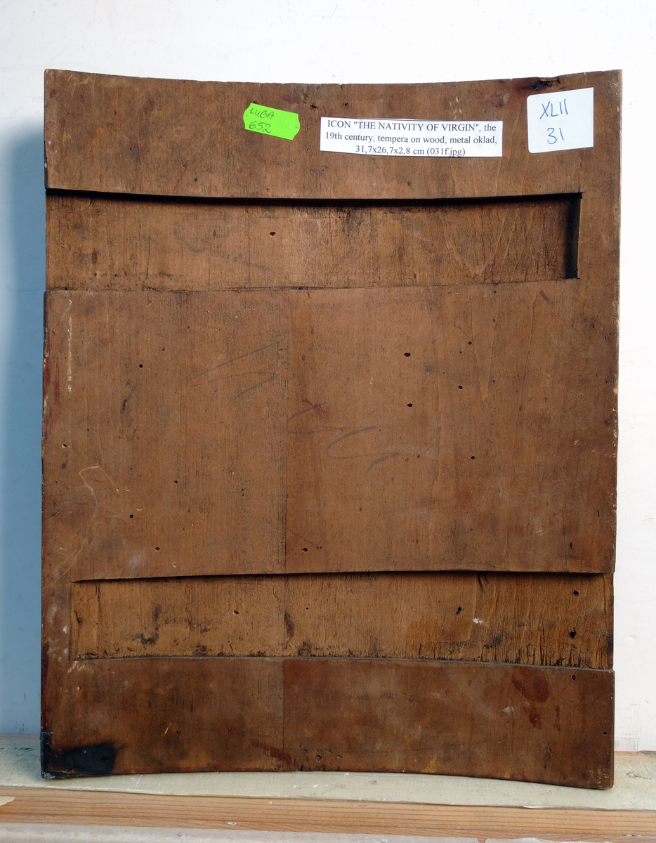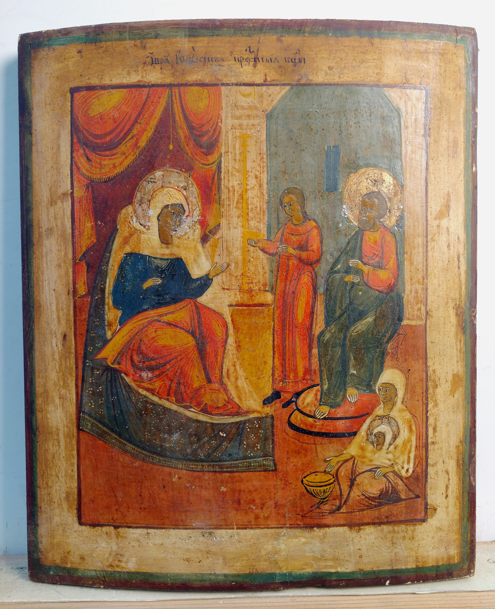 Icon depicting the Nativity of the Virgin Mary in silvered brass oklad revetment cover. The Nativity of the Theotokos is a Christian feast day commemorating the birth of the Blessed Virgin Mary and universally celebrated on September 8th. The icon depicts Saint Anne reclining in her bed watching the infant Mary being held by a midwife. Mary’s father Joachim is shown seated, thanking God for a successful delivery of his daughter.