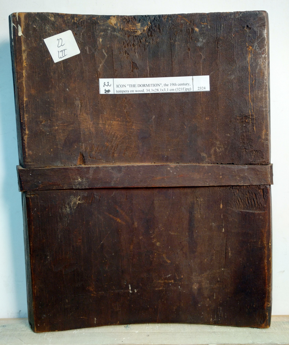 The Dormition of the Most Holy Mother of God is a Great Feast of the Eastern Orthodox Church (corresponding to the Western feast of the Assumption) which commemorates the "falling asleep" or death of the Mother of God, and her bodily resurrection before being taken up into Heaven. The Theotokos is depicted lying on a bier, surrounded by the twelve Apostles. At center, Jesus Christ is shown in a golden mandorla, swaddling the soul of the Virgin Mary. To either side of him are depicted the Hieromartyrs Dionysius the Areopagite and Ignatius the God-Bearer who, according to sacred tradition, are responsible for transmitting the account of the dormition. The buildings on the background represent Mary's house and the Temple of Jerusalem.