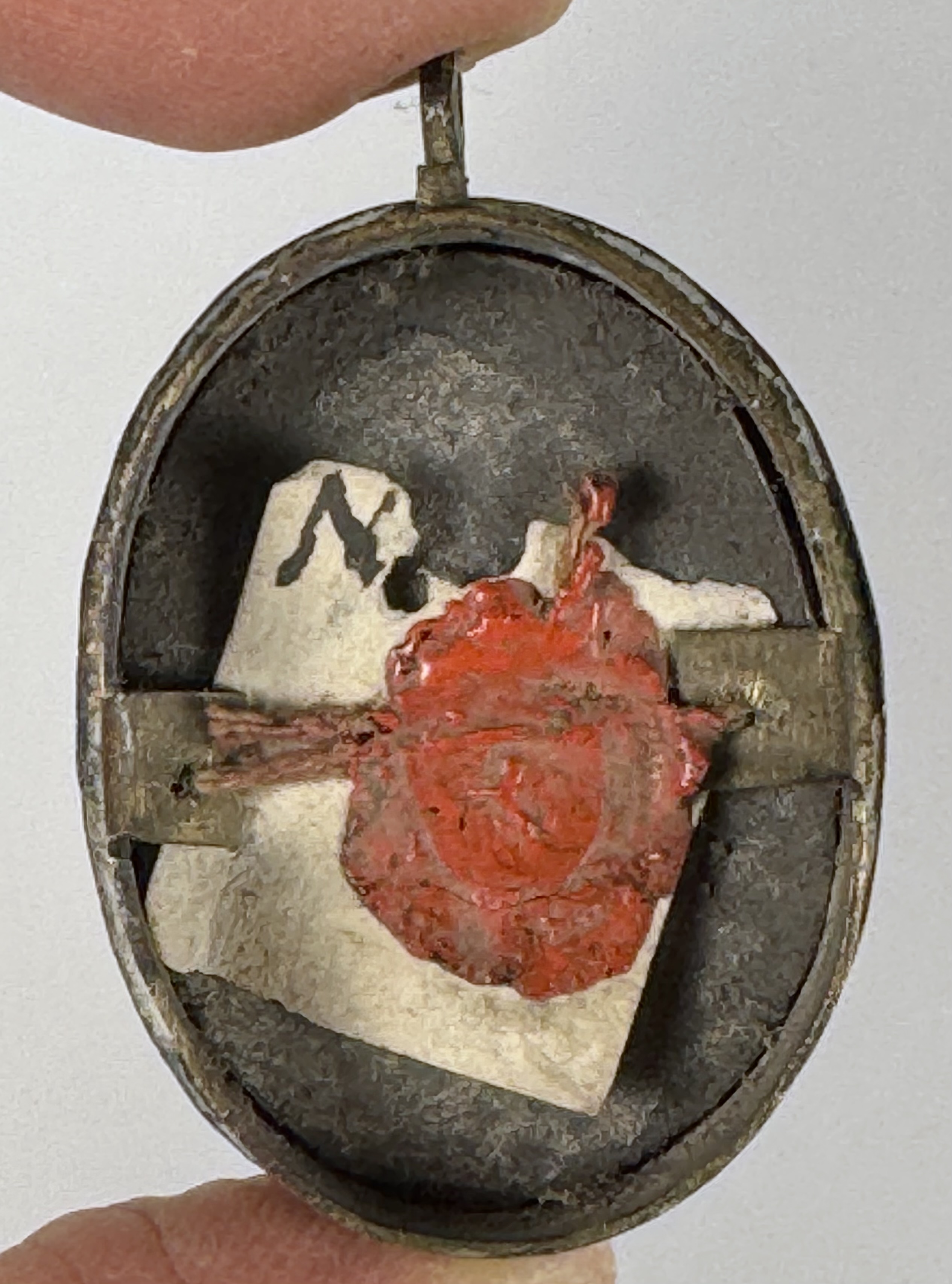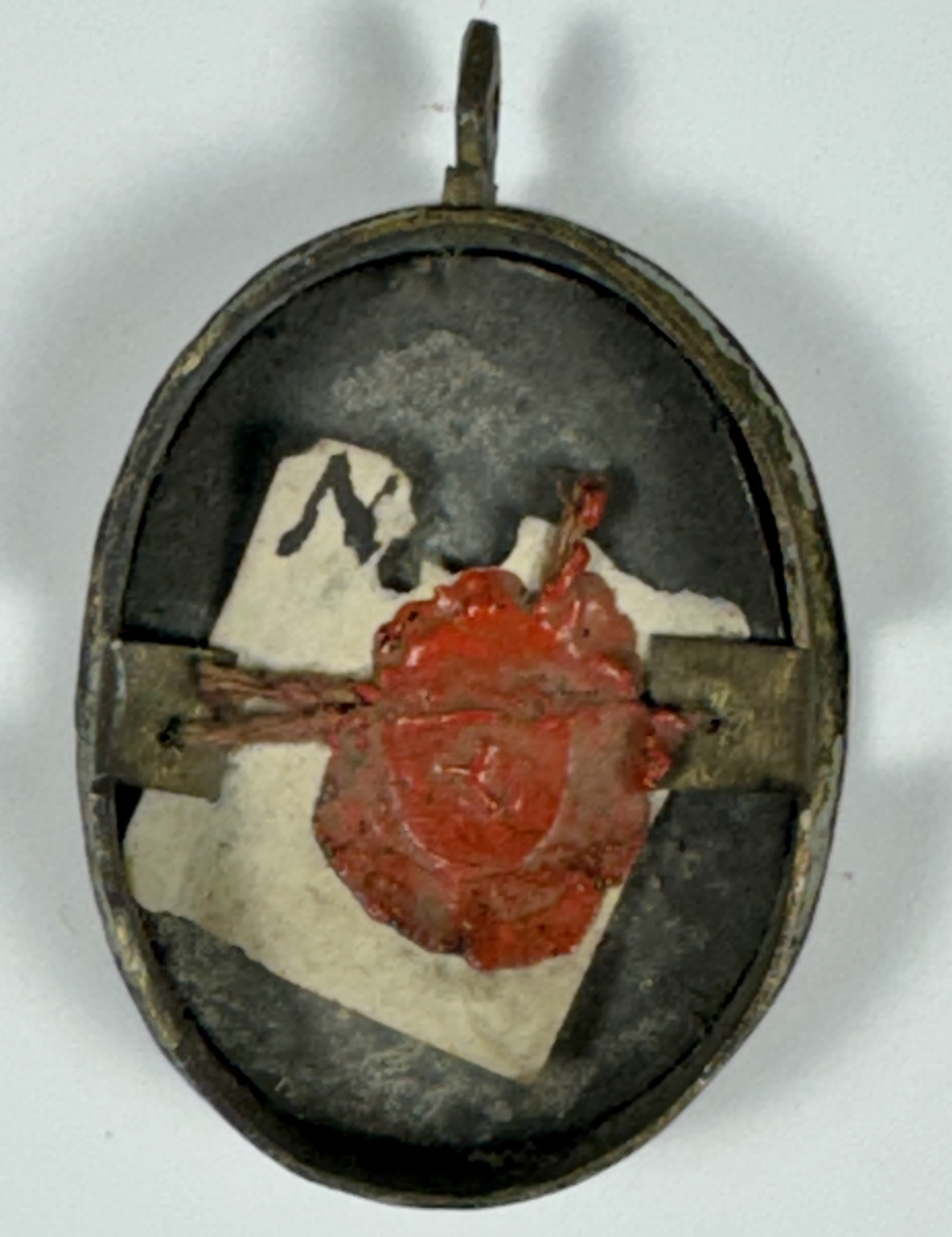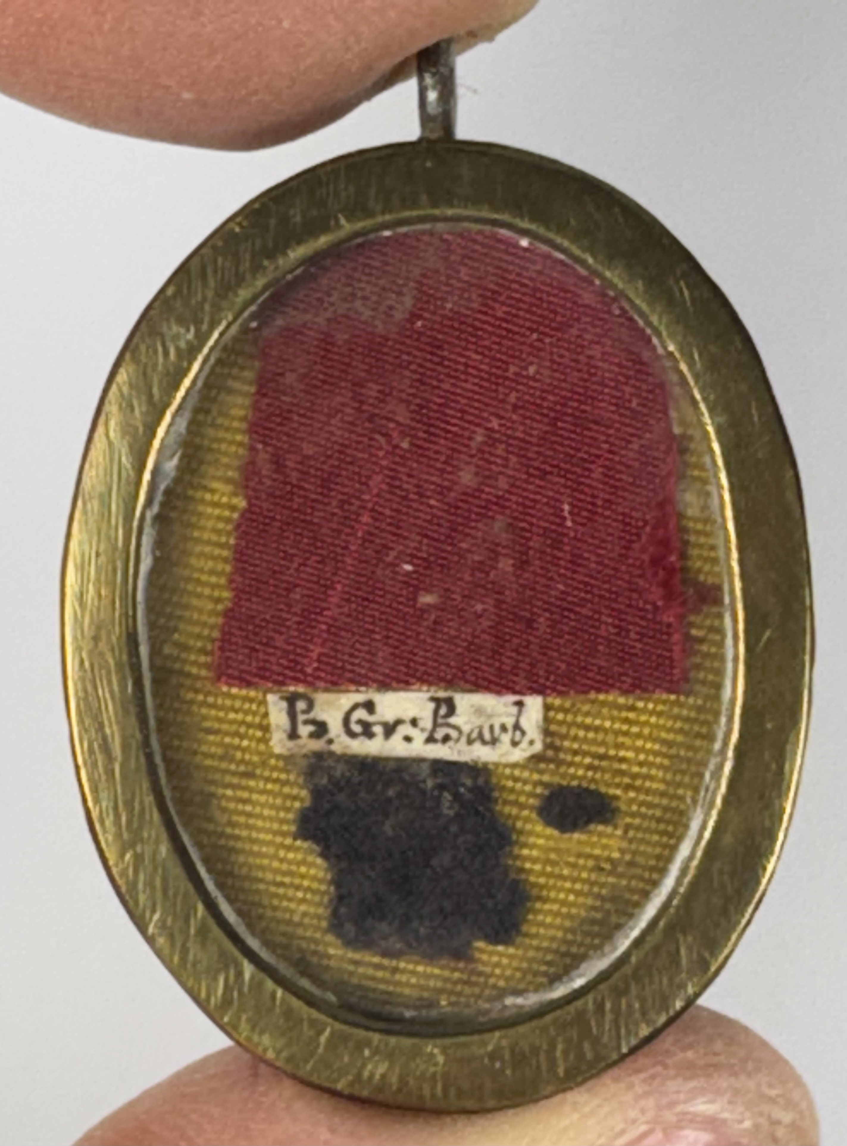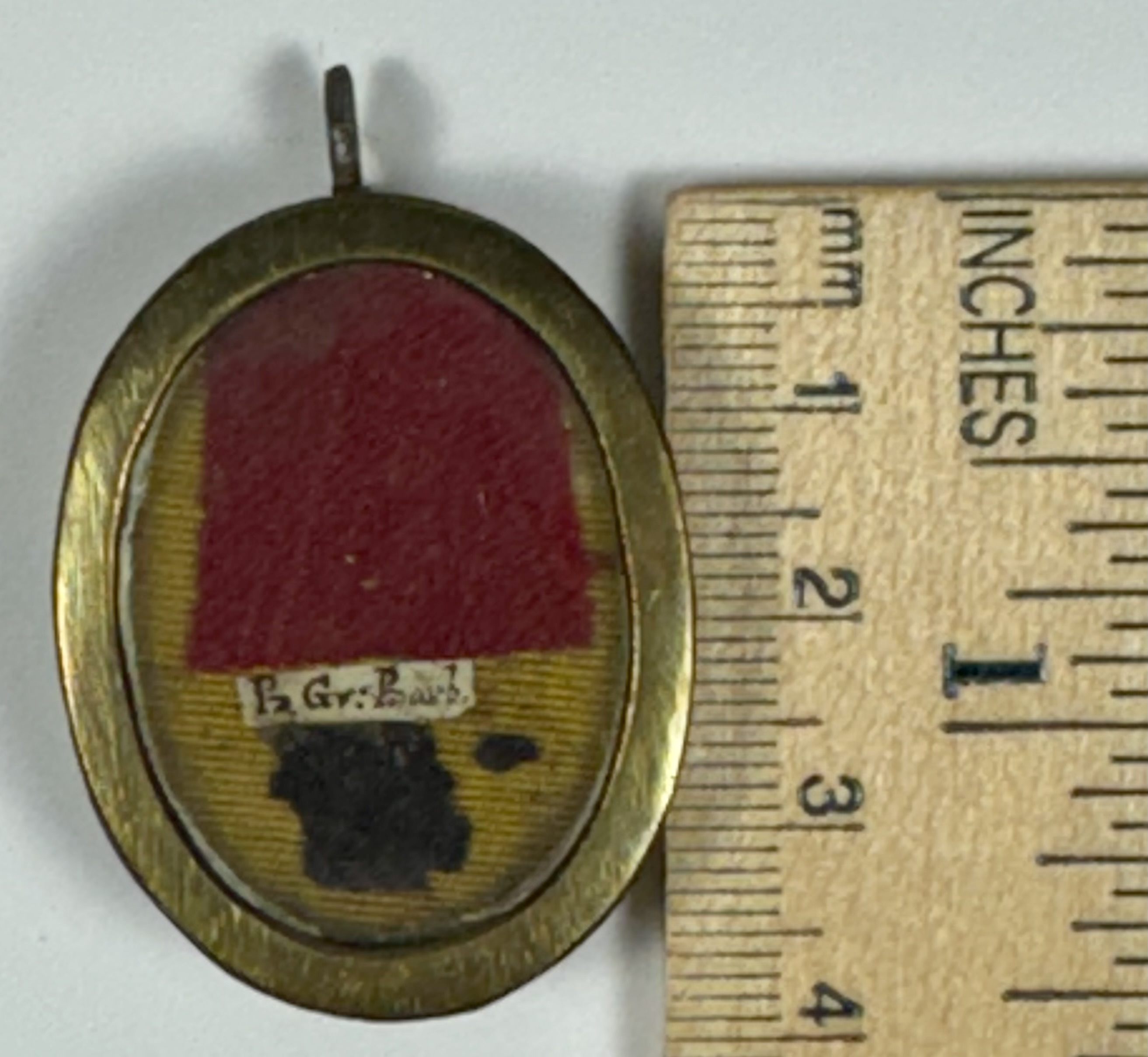 Oval glass-fronted brass pendant reliquary theca housing two second-class ex indumentis (of the clothes) pre-canonization relics of Saint Gregory Barbarigo. The relics are affixed to a gold silk ground identified in Latin on a manuscript cedula label as B. Gr: Barb. (Blessed Gregory Barbarigo.). On the back, the theca is secured with a perfectly preserved seal of red Spanish wax bearing an imprint with a coat of arms of Fr. Antonio Cantoni (†1781), Bishop of Faenza, Italy (1742–1767) and Archbishop of Ravenna, Italy (1767–1781).
