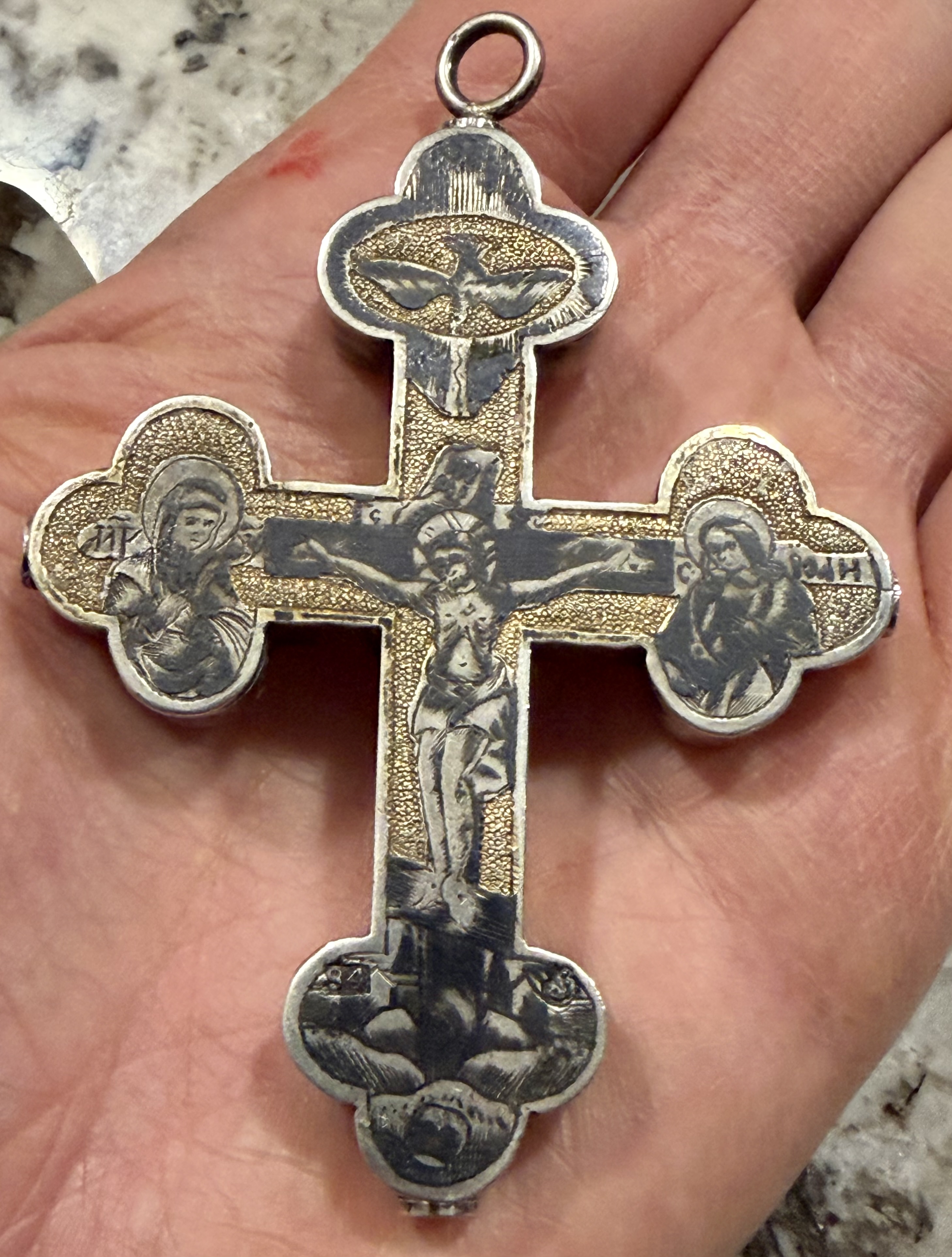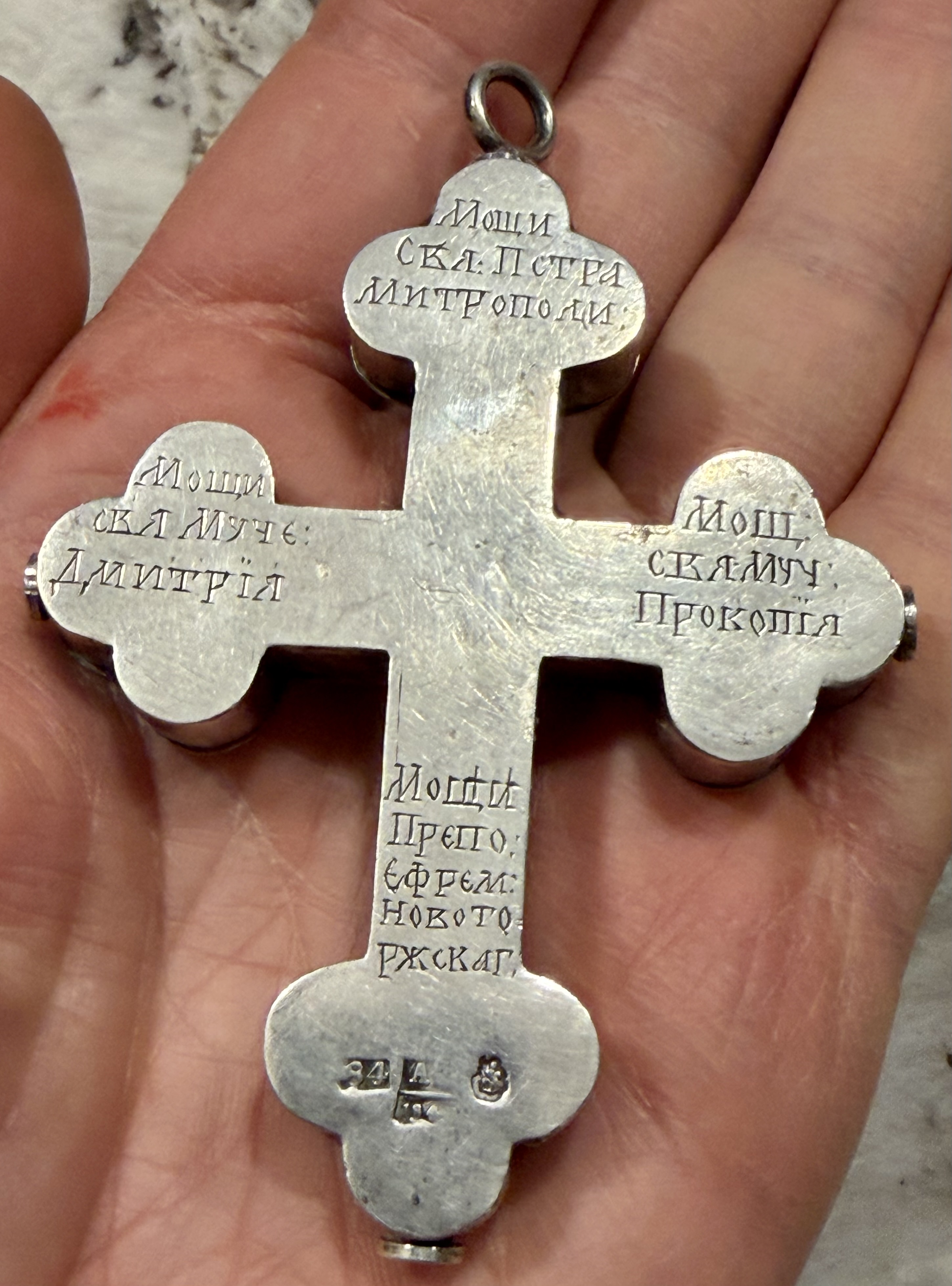 Редкий православный серебряный мощевик-реликварий в форме наперсного креста, украшенный на лицевой стороне искусно выполненной позолоченной и черненой сценой Распятия, по бокам которой изображены Пресвятая Богородица и святой Иоанн Богослов, а сверху - Святой Дух в виде голубя. Внутри мощевика хранятся мощи четырех значимых православных святых: святого великомученика Димитрия Солунского, святого Петра, митрополита Московского, святого мученика Прокопия Скифопольского и преподобного Ефрема Новоторжского, основателя Борисоглебского монастыря. На оборотной стороне мощевика надписи на старославянском языке: МОЩИ СВЯ: ПЕТРА МИТРОПОЛИ: (Мощи святого Петра, митрополита [Московского]) / МОЩИ СВЯ МУЧЕ ДМИТРIЯ (Мощи святого мученика Димитрия) / МОЩ: СВЯ МУЧ ПРОКОПIЯ (Мощи святого мученика Прокопия) / МОЩИ ПРЕПО: ЕФРЕМ: НОВОТОРЖСКАГО (Мощи преподобного Ефрема Новоторжского). Как лицевая, так и оборотная стороны мощевика имеют московское пробирное клеймо, и дату на оборотной стороне — 184?.